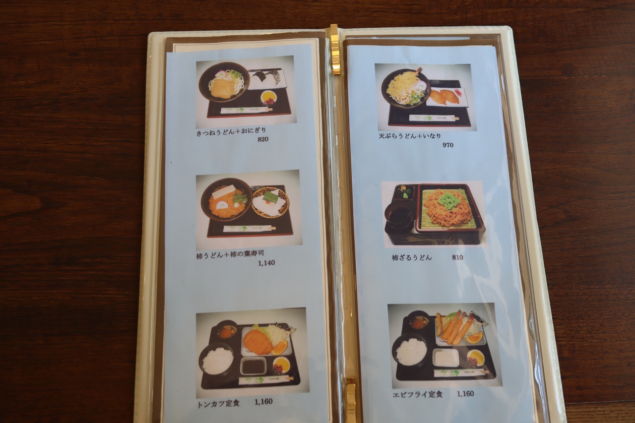 法隆寺観光を終えて南大門に戻ってきたとき一番近いところにある店舗です。「法隆寺名物 柿うどん」というのれんが目に入り気になり注文しました。何とオレンジ色のそばがウズラの卵と共に運ばれてきました。目をつむって食べてみると普通にそばでした。炎天下で疲労した体にエアコンが効いた店内は天国のように感じました。