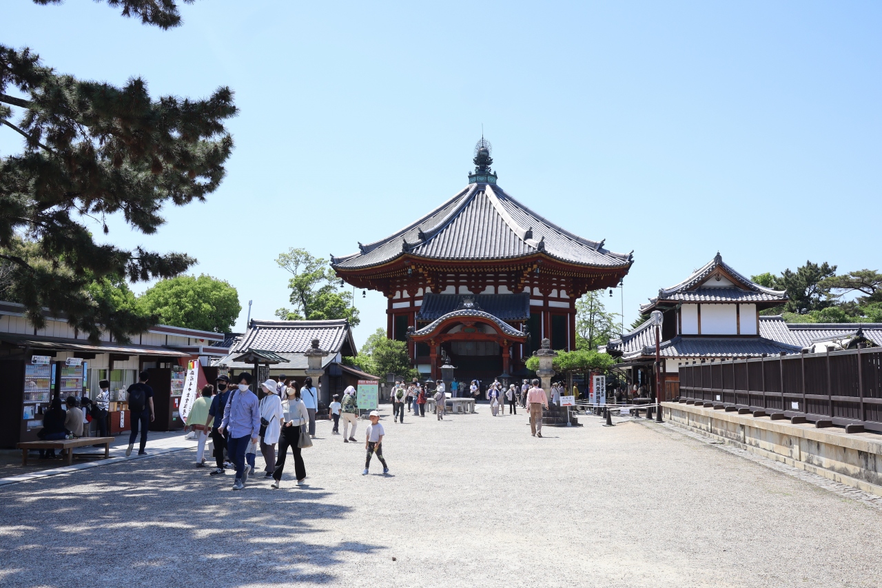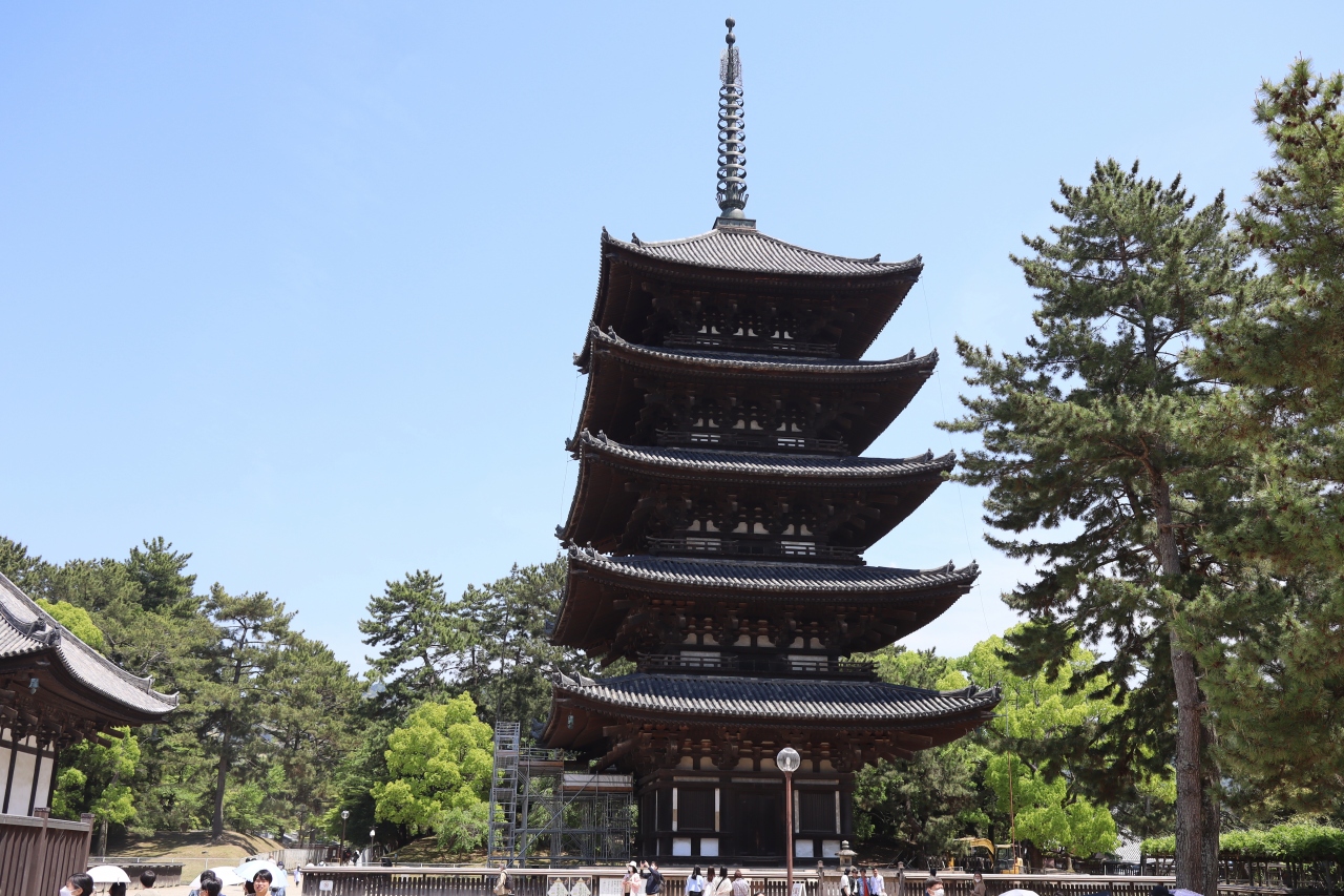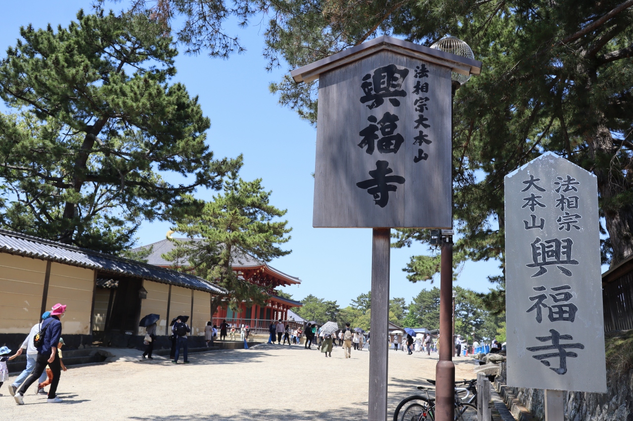 奈良の興福寺に行くにはJR奈良駅から三条通りをなだらかに上って行きます。近鉄奈良駅からの方がもっと近いです。興福寺は東大寺や春日大社と同様に奈良観光ではテッパンの観光スポット。大化の改新で有名な藤原鎌足が釈迦三尊像を造立し、それを妻の鏡大王が山階寺に安置したのが始まりと言われています。境内には、五重塔、東金堂、国宝館など見ごたえのある建造物が建っているので、ゆっくりと見てまわるのが良いと思います。但し、猛暑の中で日差しをさえぎるものがありません。