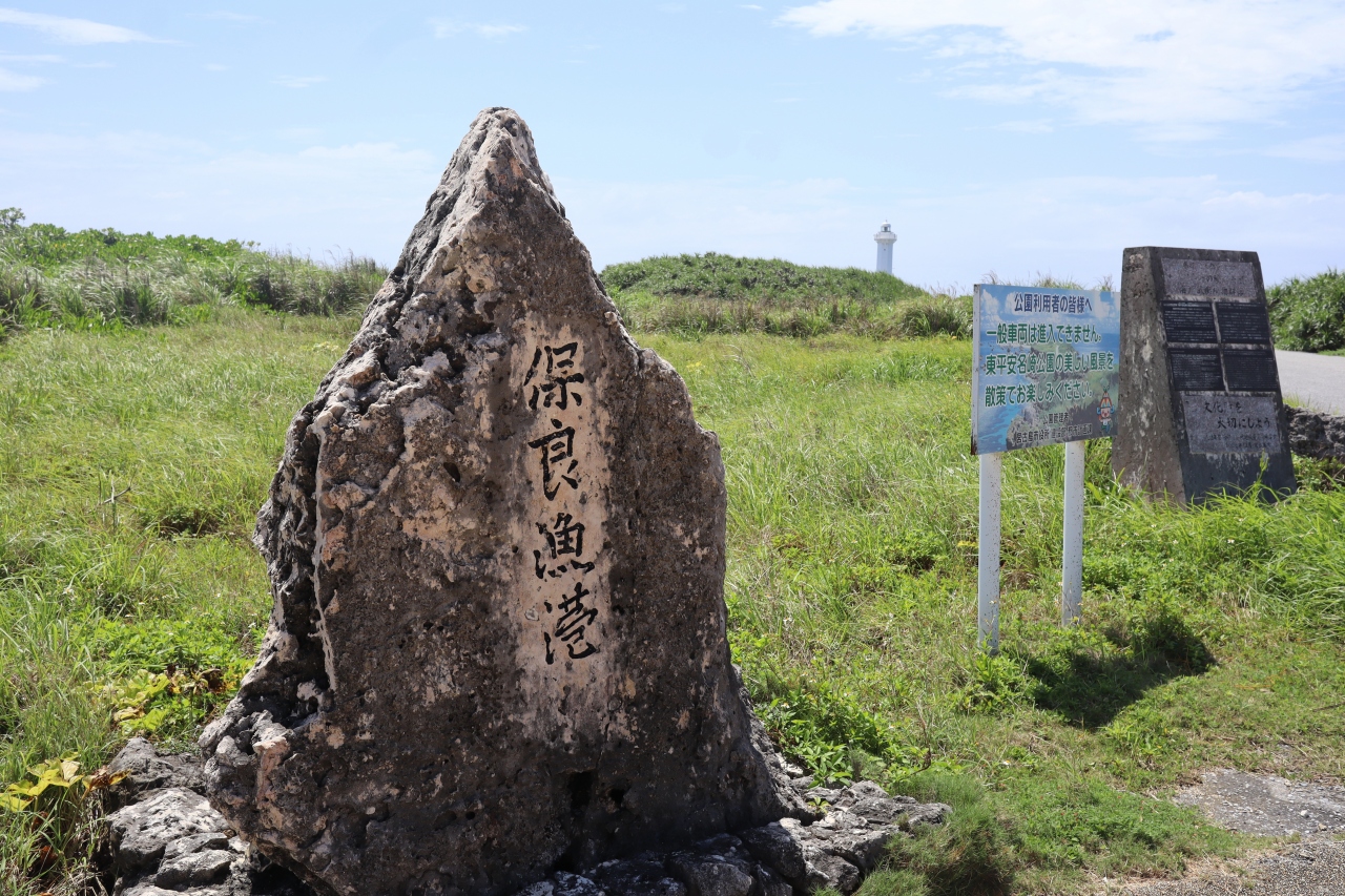 宮古島の最東端にある東平安名崎(ひがしへんなざき)灯台に行くとき、ドン突きの駐車場に停めて数百メートル歩きますが、灯台に向かう時に施設料300円、灯台に上る場合は300円がかかります。今年2月に上ったばかりなので今回は駐車場から海岸方面に下った保良海岸を散策しました。とてもきれいな宮古ブルーの漁港です。