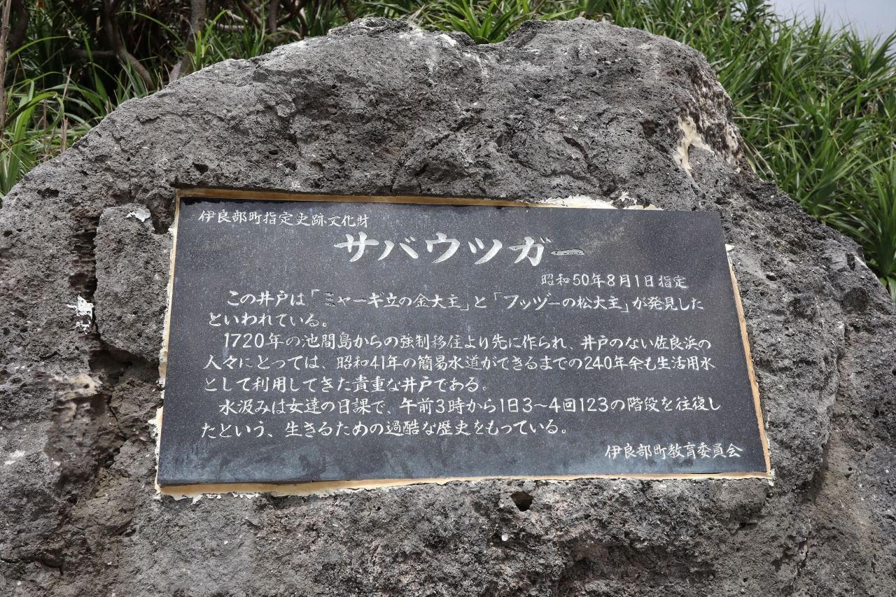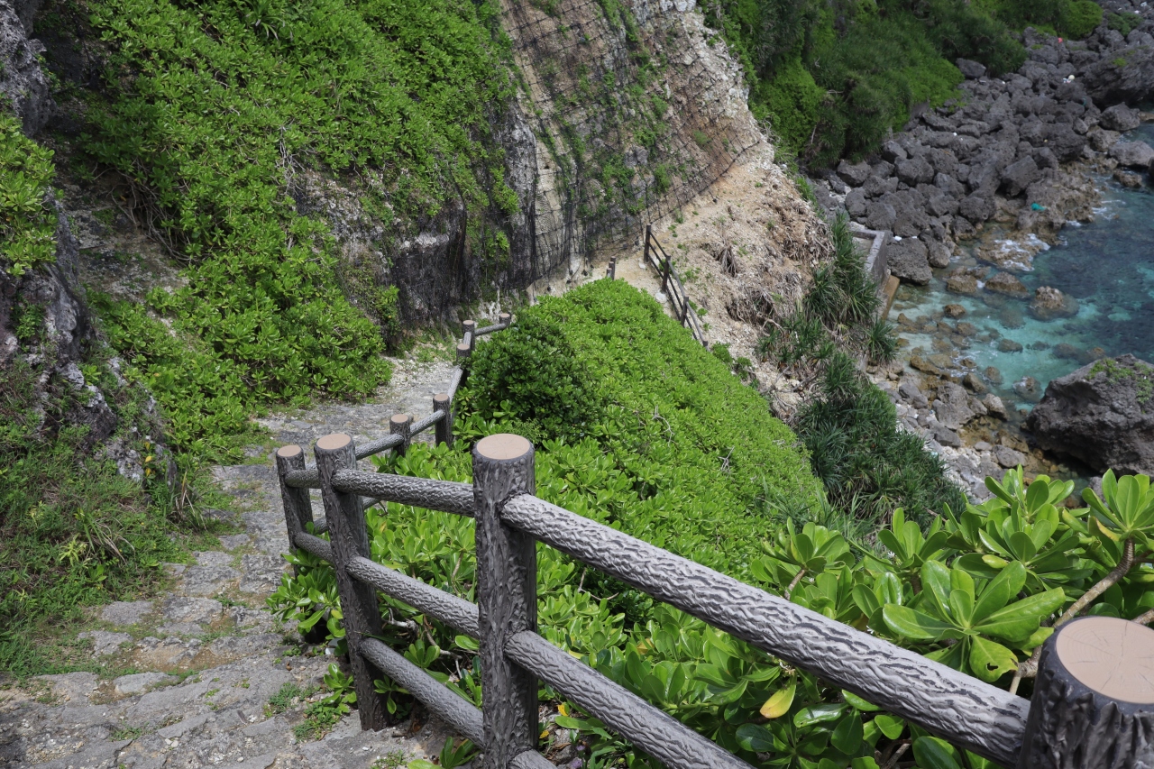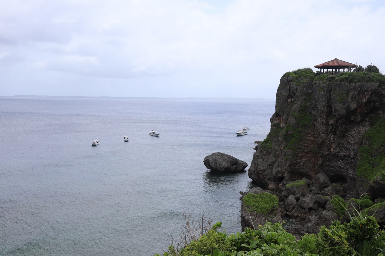 佐和田の浜から下地島空港佐良浜線を時計回りに進むと、白鳥岬やフナウサギバナタを通ってしばらくすると佐良浜漁港の方へ坂を下って行きます。坂を下ったところを左に曲がって進むと行き止まりがサバウツガーです。断崖絶壁からの光景がすばらしくシュノーケリングをしている人たちが見えました。アクティビティ船も数席浮かんでいました。眼下には綺麗な宮古ブルーが広がっていました。