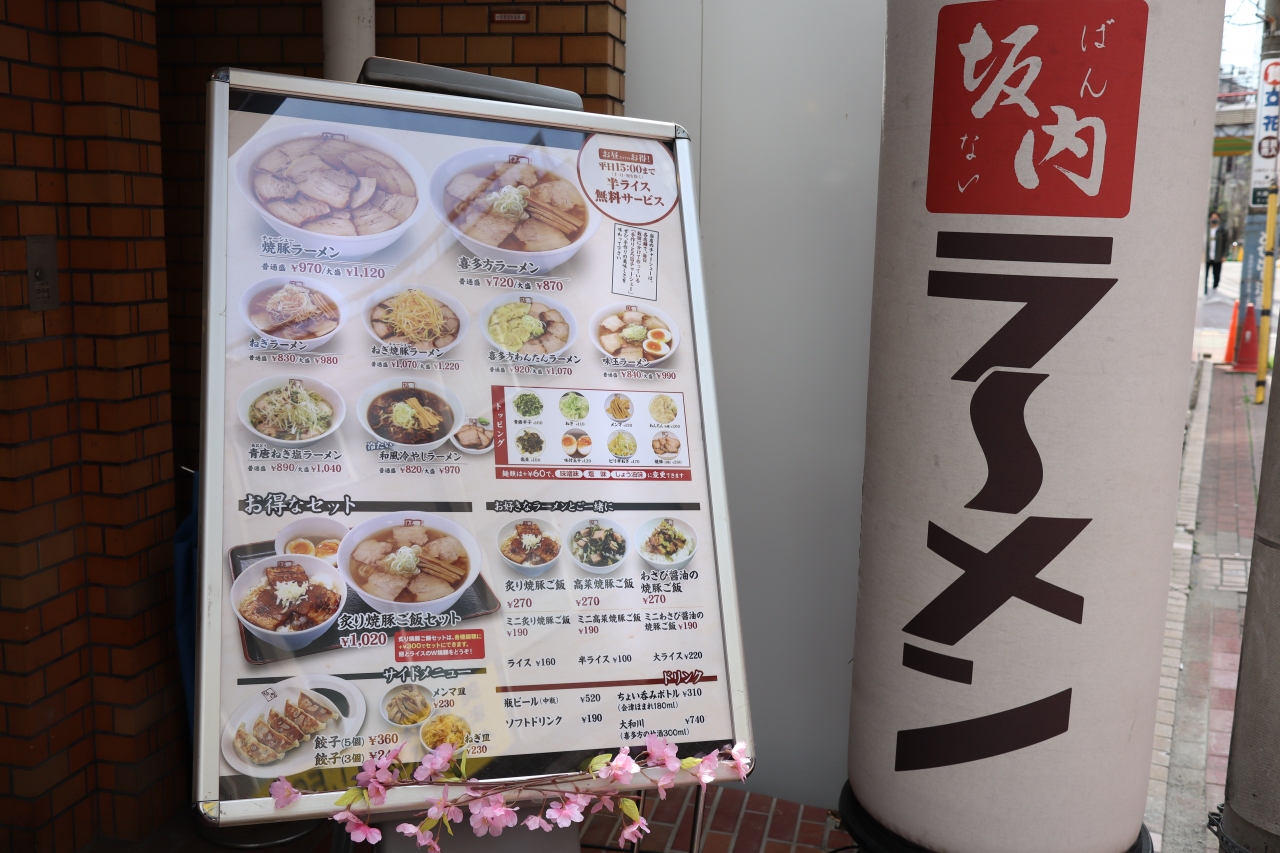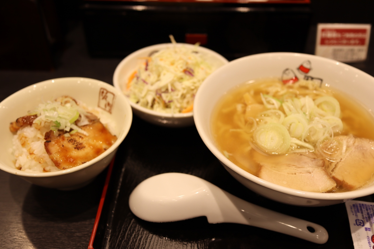 JR京浜東北線の大森駅東口から2分、開店11時からわずかしか経っていないにも関わらずほぼ満席状態。客層としては年配者やサラリーマンが多いのでリピートされている方々だと思います。この日は小ラーメンと小炙り焼き豚ごはんと野菜サラダがセットになったミニ坂内セット(税込730円)を注文しました。喜多方ラーメンは脂っぽくなくサラッとあっさりしています。