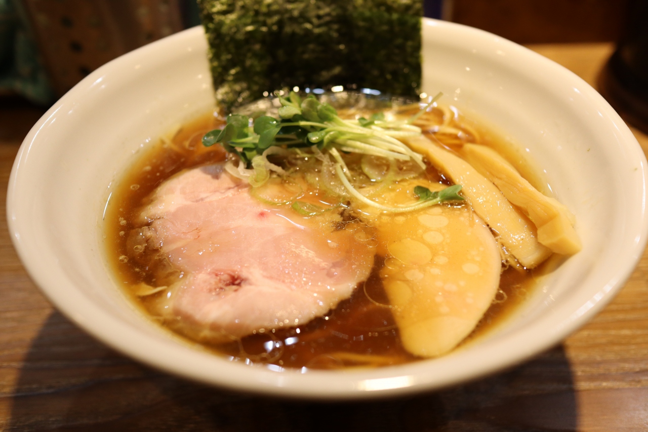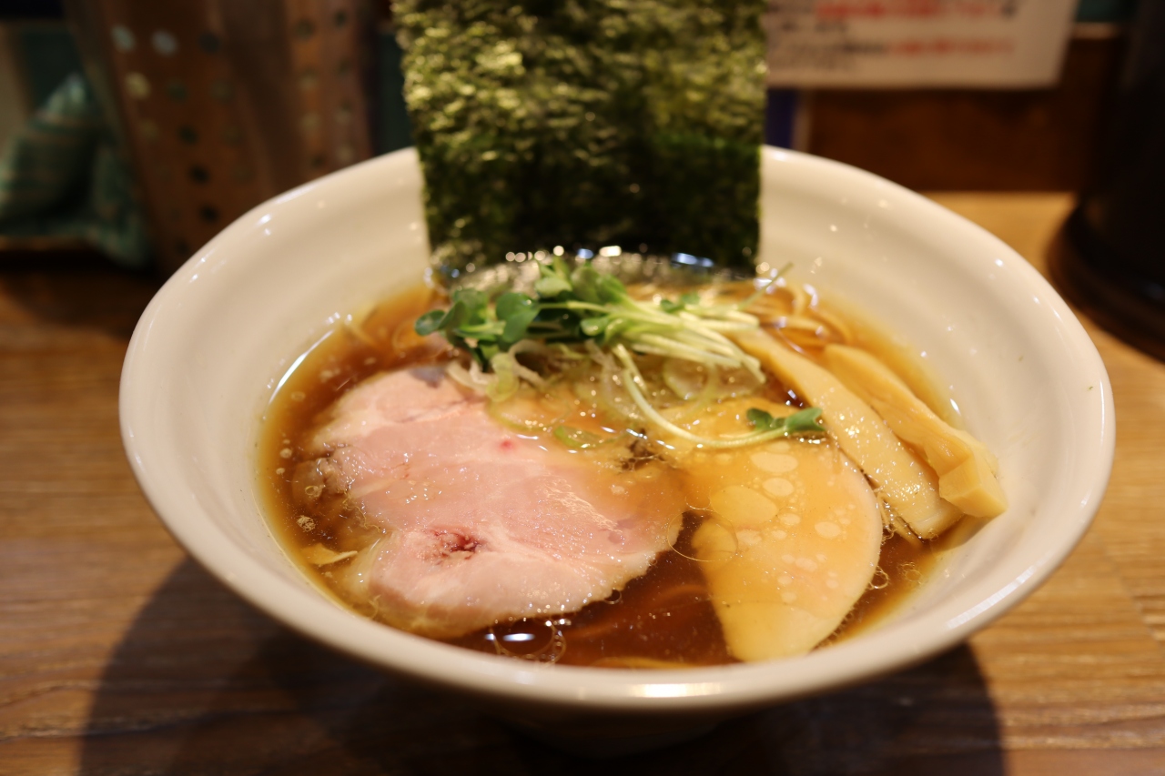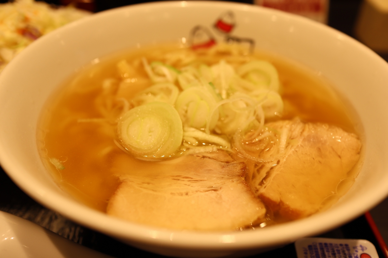 メニューは大きく分けると中華そばの「醤油」と「しお」の二種類。そして醤油と塩のいずれでも「あっさり鶏清湯」と「こってり鶏白湯」の二種類が選択できます。一番上のポピュラーな「あっさり鶏清湯」を注文しました。替え玉は後で現金払い可、麺だけではなく具材が少し一緒に盛ってくるのでそのままでも食べられます。