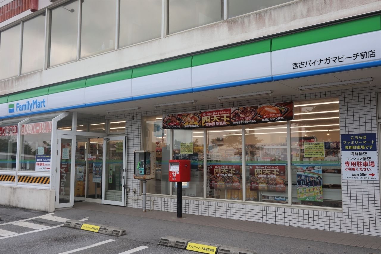 宮古島中心部の平良(ひらら)にあるパイナガマビーチ、パイナガマビーチは市街地にあるビーチにも関わらずゴミも散乱しておらず海は緑色で美しいです。この辺りでのコンビニエンスストアはファミリーマートパイナガマビーチ前店があります。ホテルローカスに宿泊しましたが何度もビーチを見に行って何度も訪れたコンビニでした。