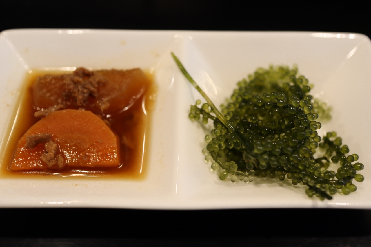 宮古島中心部の平良(ひらら)地区にある居酒屋の中山(ちゅうざん)に夕方訪問しました。まず、付け出しの海ブドウと刺身の盛り合わせの旨さに心が打たれました。そして、メニューにイチオシ人気と書かれたカツオの腹皮ふわふわ揚げもオリオンビールにとても合いました。