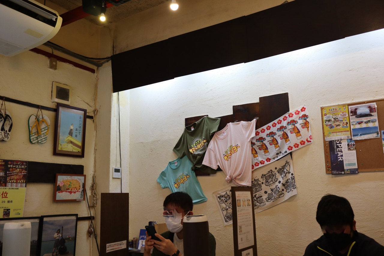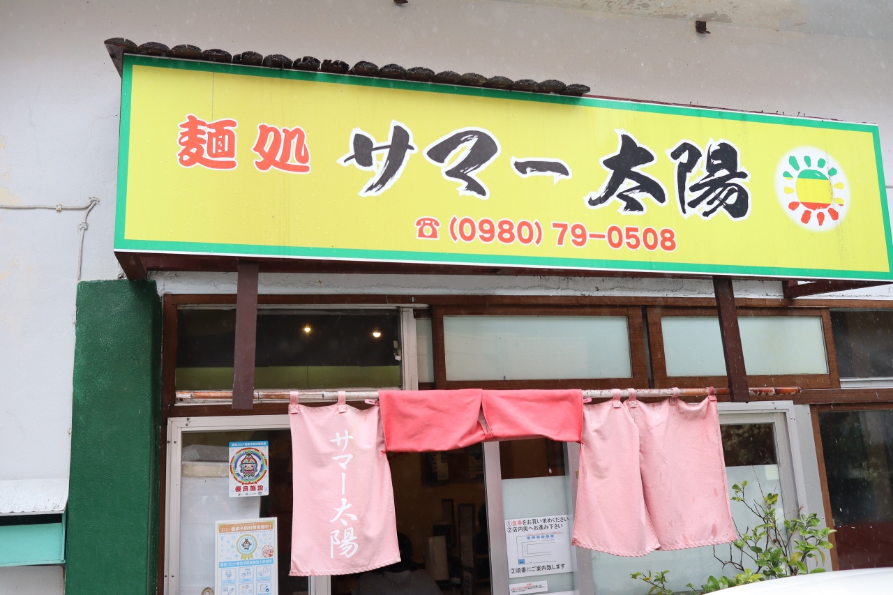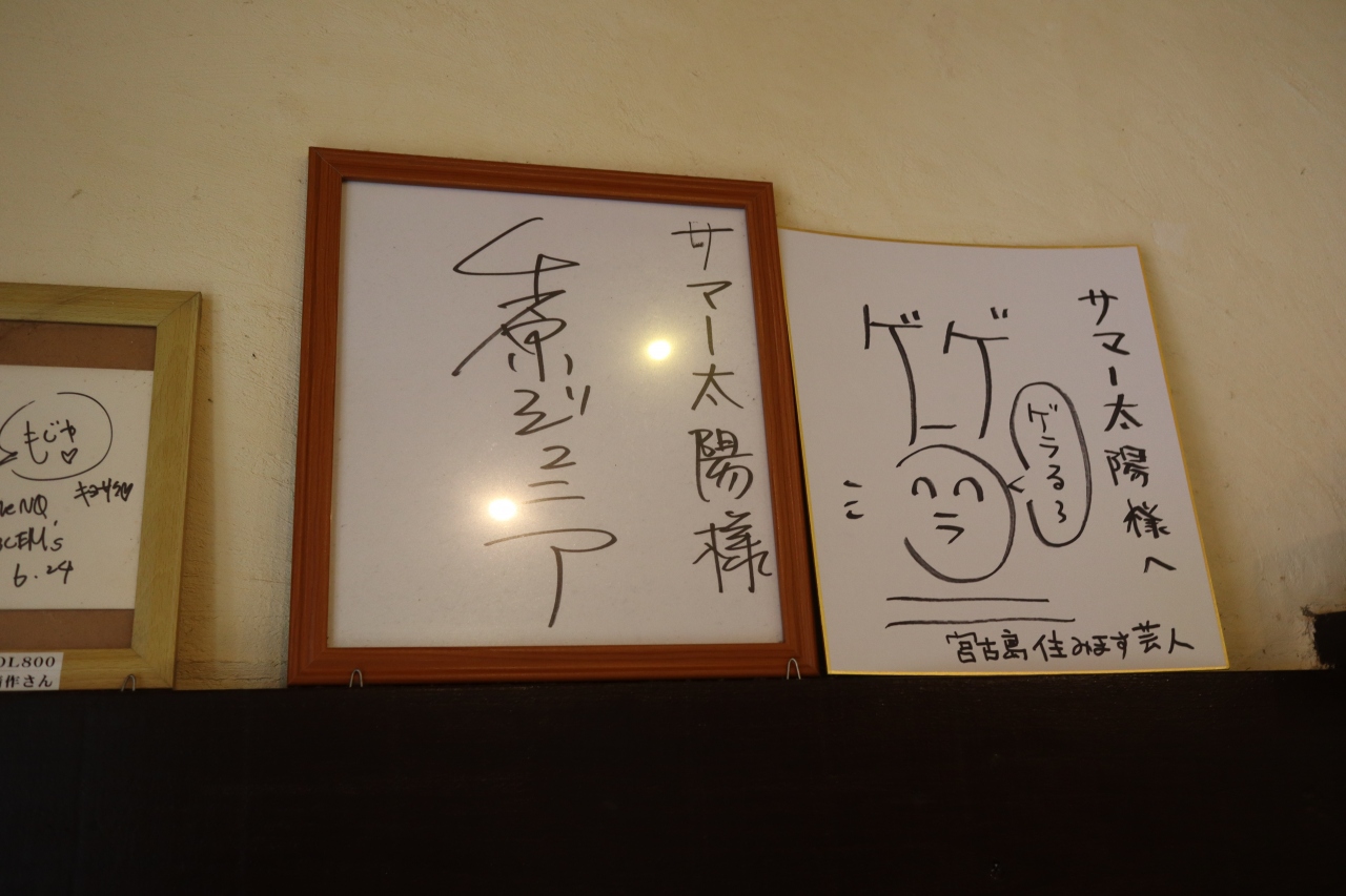 宮古島の中心部平良下里「麺屋 サマー太陽」はラーメン日本一決定戦で全国6位の実績があります。この日は11:00の開店からまもなくして訪問しましたがコの字状の10席カウンターはすでに満席で店頭にて若干の行列に並ぶことに。外観から想像する以上に店内は広く食券制、有名芸人の色紙もありました。日曜定休日ですので要注意。