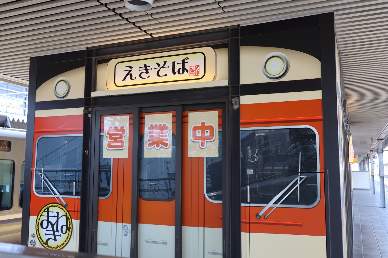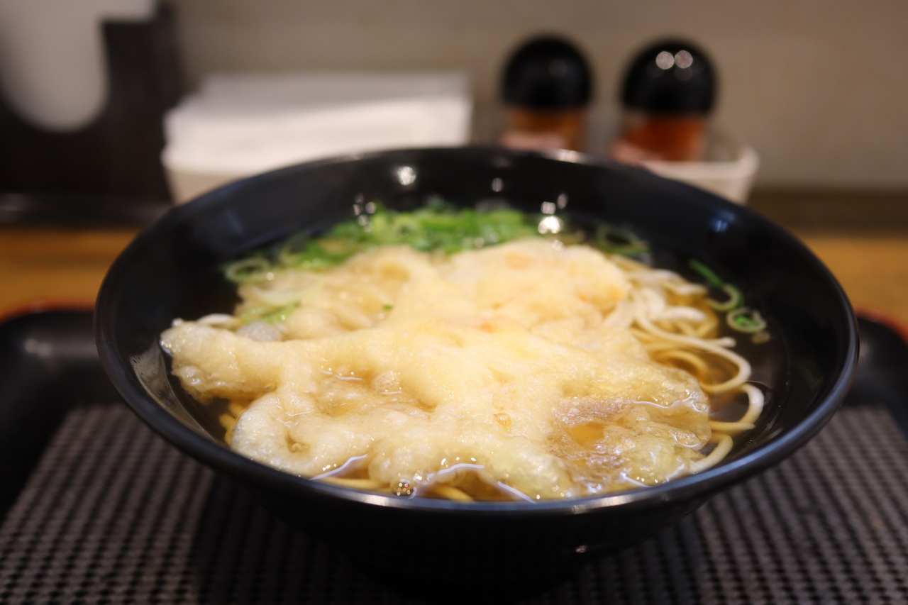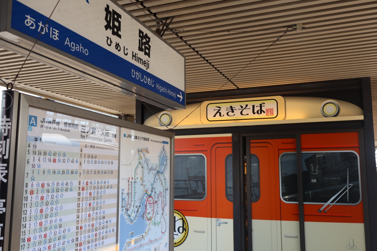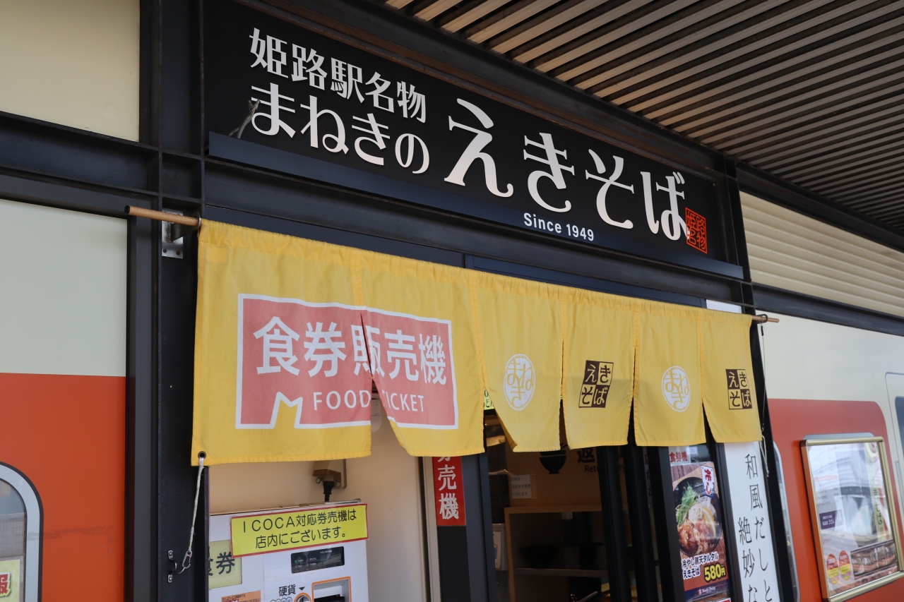 JR姫路駅の在来線ホームには上り下りともに「まねきのえきそば」というお蕎麦屋さんがあります。えきそばというのは麺が中華麺、白い細麺でダシスープもおいしいです。天ぷらえきそば、きつねえきそば390円、きつねうどん400円など破格です。おいなりさんや助六とのセットメニューもあります。写真は「天ぷらえきそば」です。