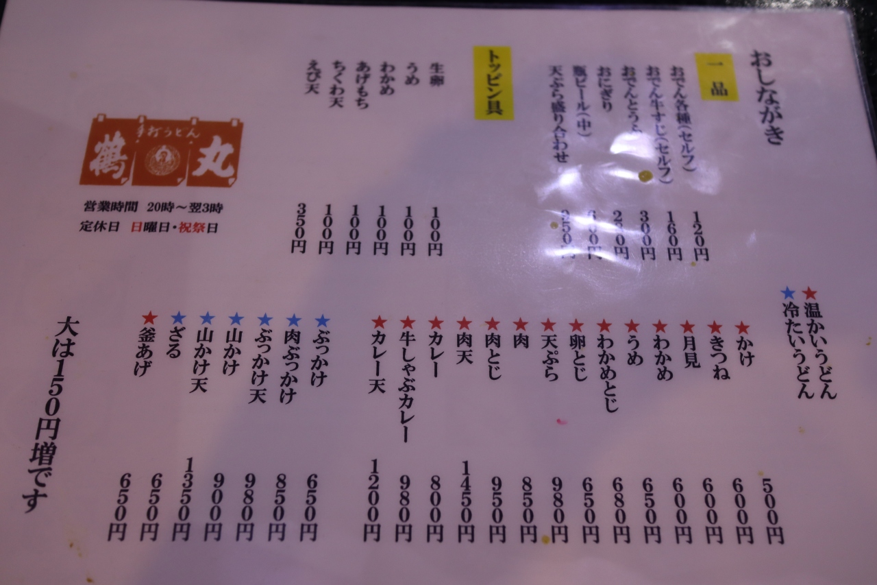 高松市中心部で夜専門で営業している讃岐うどん屋さんです。高松の多くのうどん店は午前中に開店し夕方には閉まるものですが20時開店翌3時閉店という営業時間。多くの客がカレーうどん800円を注文しますがコシがありダシが旨くて完食します。