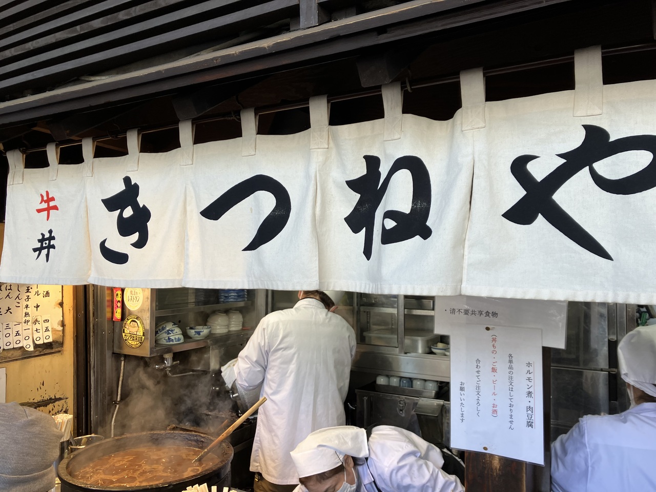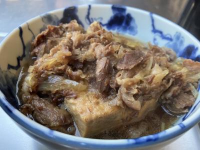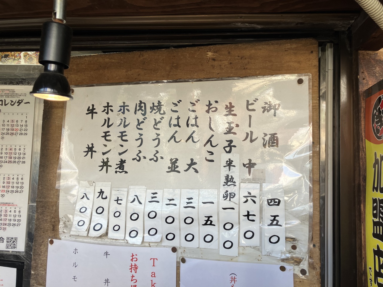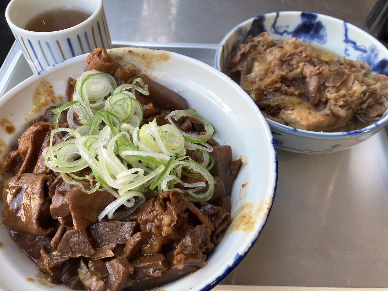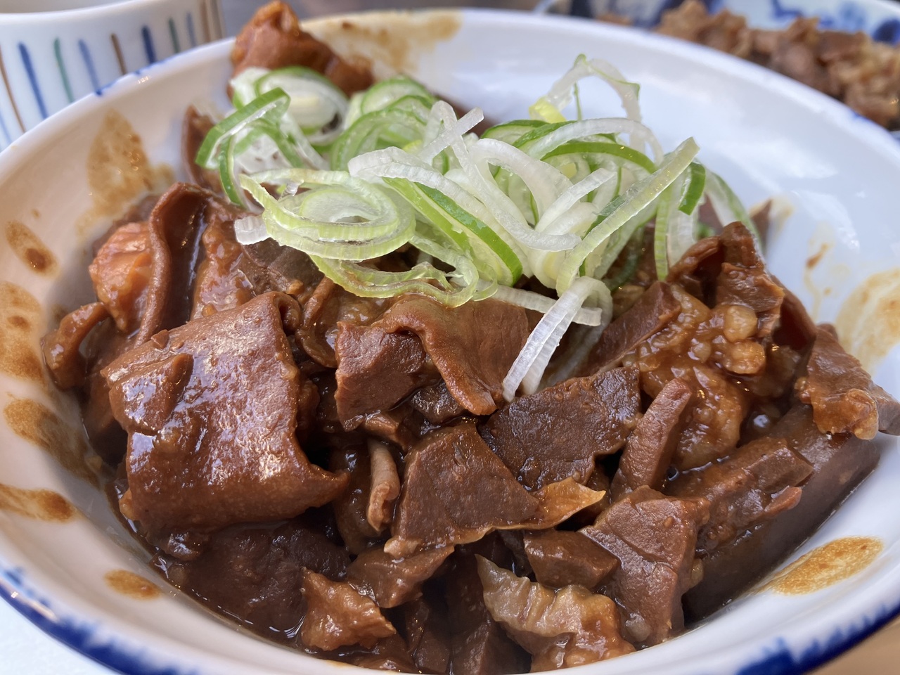 お店ののれんには牛丼と書かれているので牛丼がメインと思いきや、お客さんの注文の多くはホルモン丼のようです。2025年3月現在の価格でホルモン丼900円、肉豆腐800円となっています。