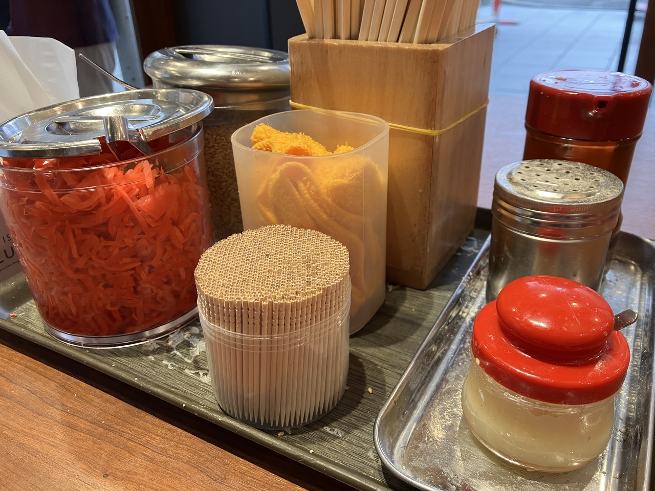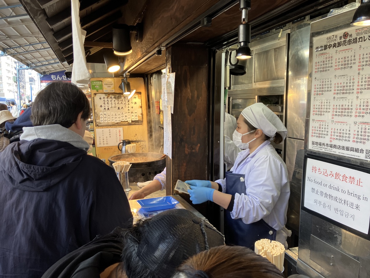 店頭には丸椅子が5席あるだけでほとんどの人は通路と道路の間で立ち食いになります。食べ終わったらお店にトレーごと返却します。そうすると行列の先頭の人に注文を伺うといった感じになっています。