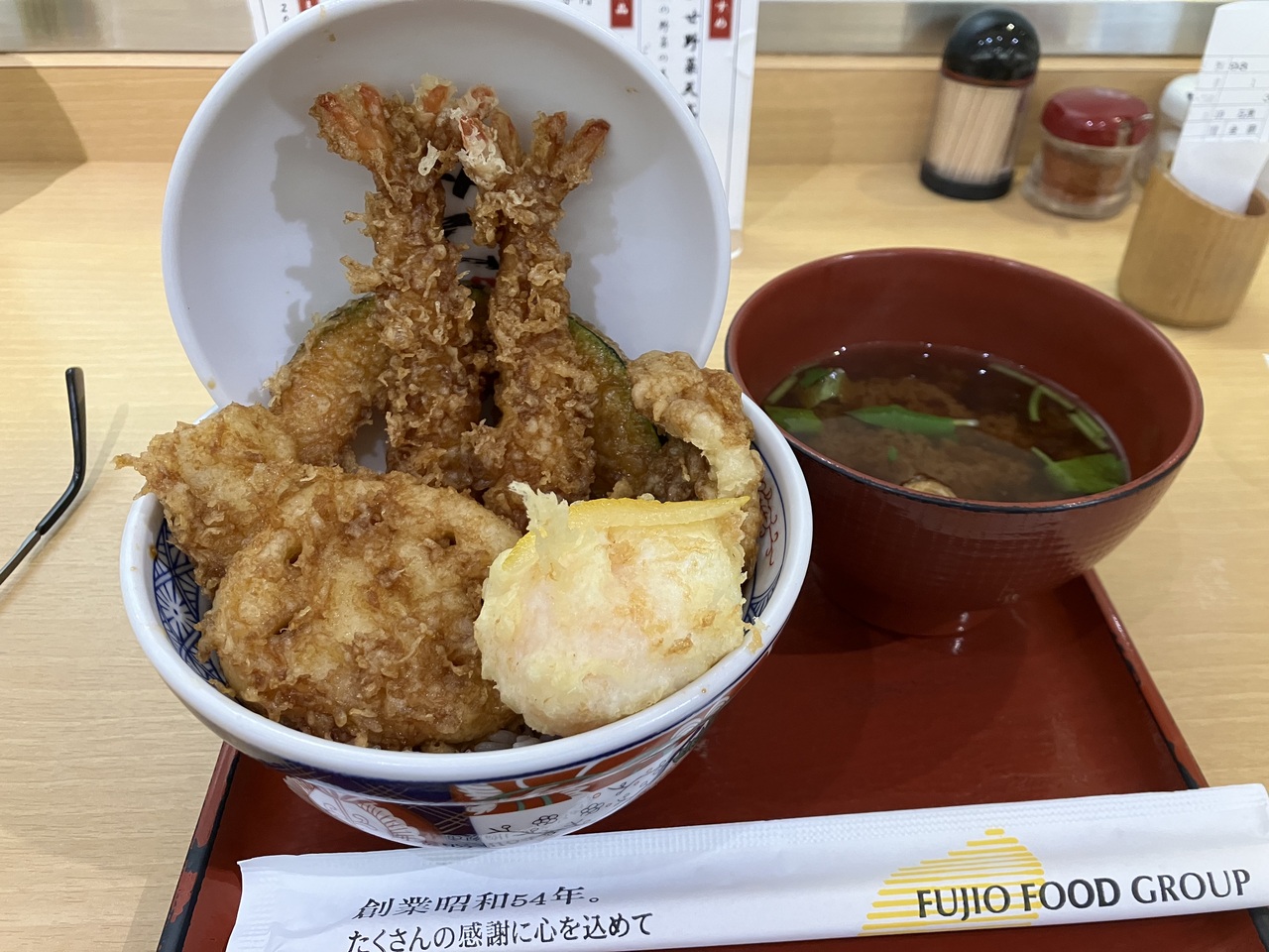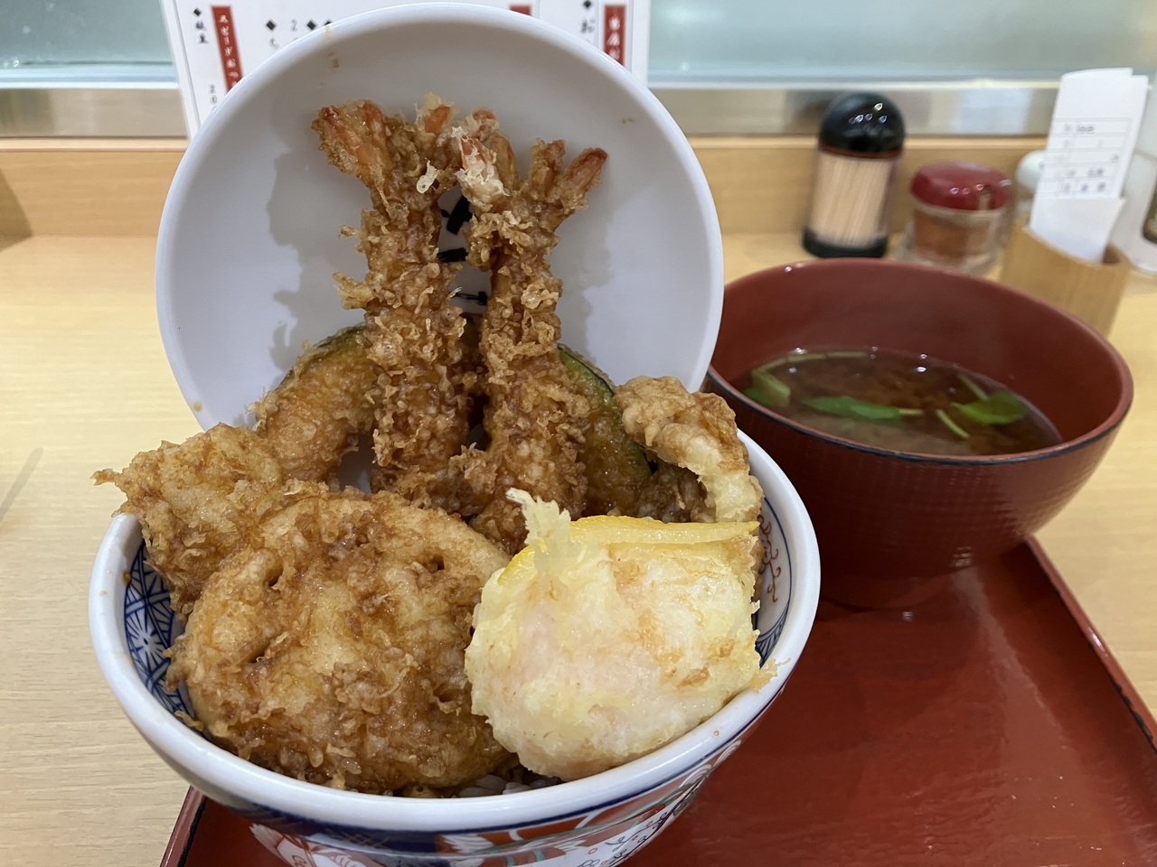岡山は岡山駅ビルさんすて一階にあります。海老2本丼税込1,280円を注文しました。野菜天が数個と玉子天に味噌汁付。海老3本丼などエビの本数でお値段が変わってきます。