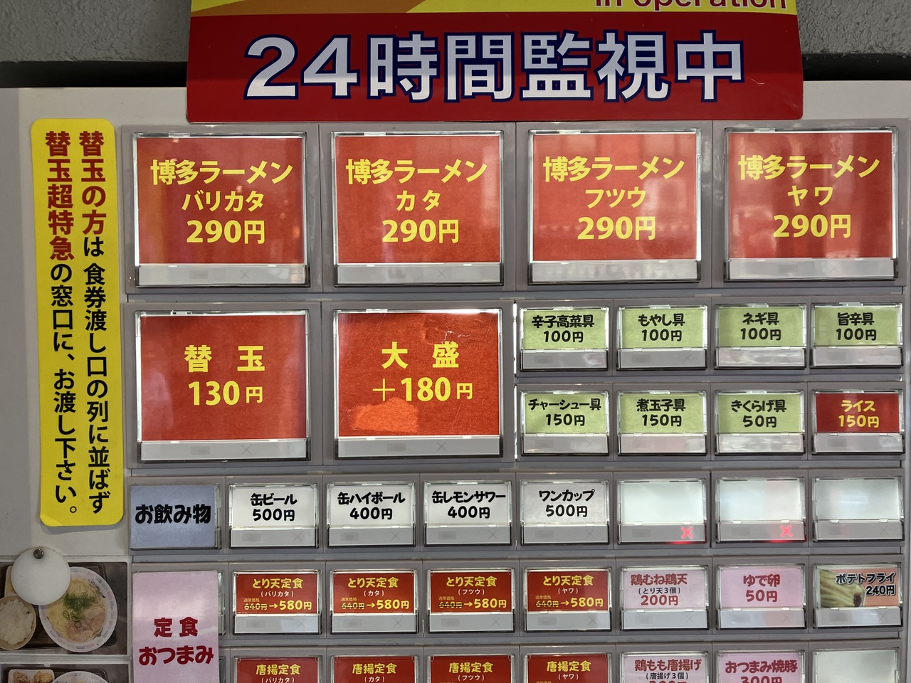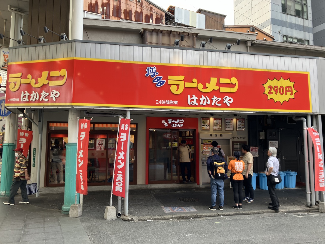 博多川端にある24時間営業の「博多ラーメンはかたや」。博多ラーメンには、バリカタ・カタ・フツウ・ヤワの選択肢がありますが共に290円。替玉130円、大盛180円とコスパ最強。実は「元祖ラーメン長浜家」と「中洲川端きりん」という博多豚骨ラーメンの名店が両隣にあります。中洲川端のラーメン激戦区にぜひ一度お越しください。