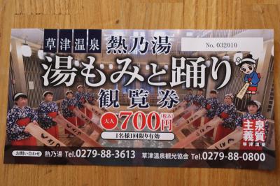 唄:草津よいと~こ、一度は~おいで (ハァ ドッコイショ)、お湯のなかにも~ (コリャ) 花が咲くよ (チョイナチョイナ)。- 旅行時期