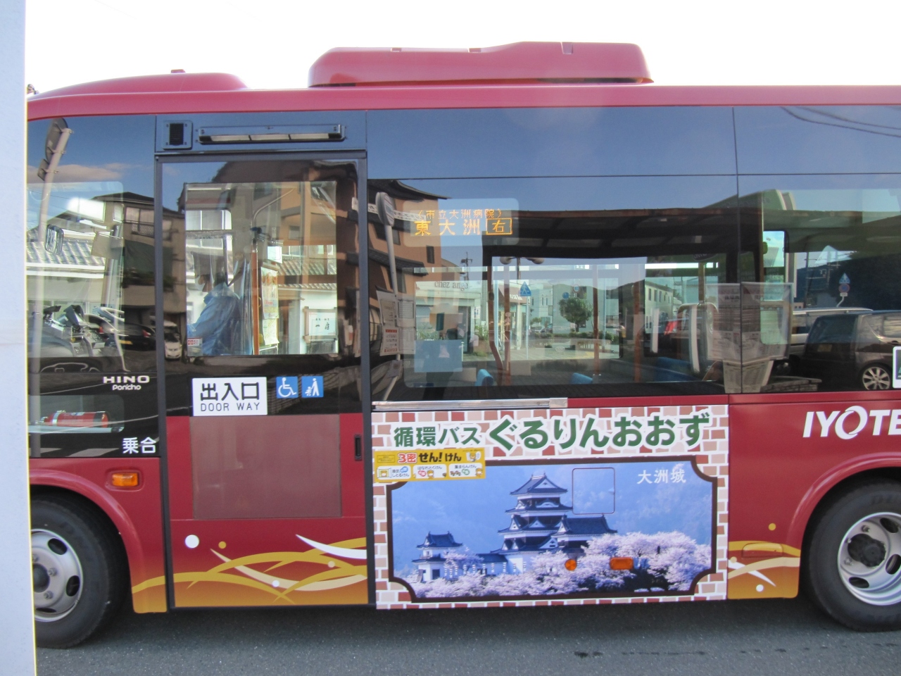 JR松山駅から特急宇和海で伊予大洲駅へ。伊予大洲駅前のバス停から東大洲左回りの伊予鉄バス「ぐるりんおおず」で大洲市内へ向かい7分、「臥龍の湯前」で降車すると近いです。歩くと結構あります。多人数なら迷わずタクシー利用が便利です。