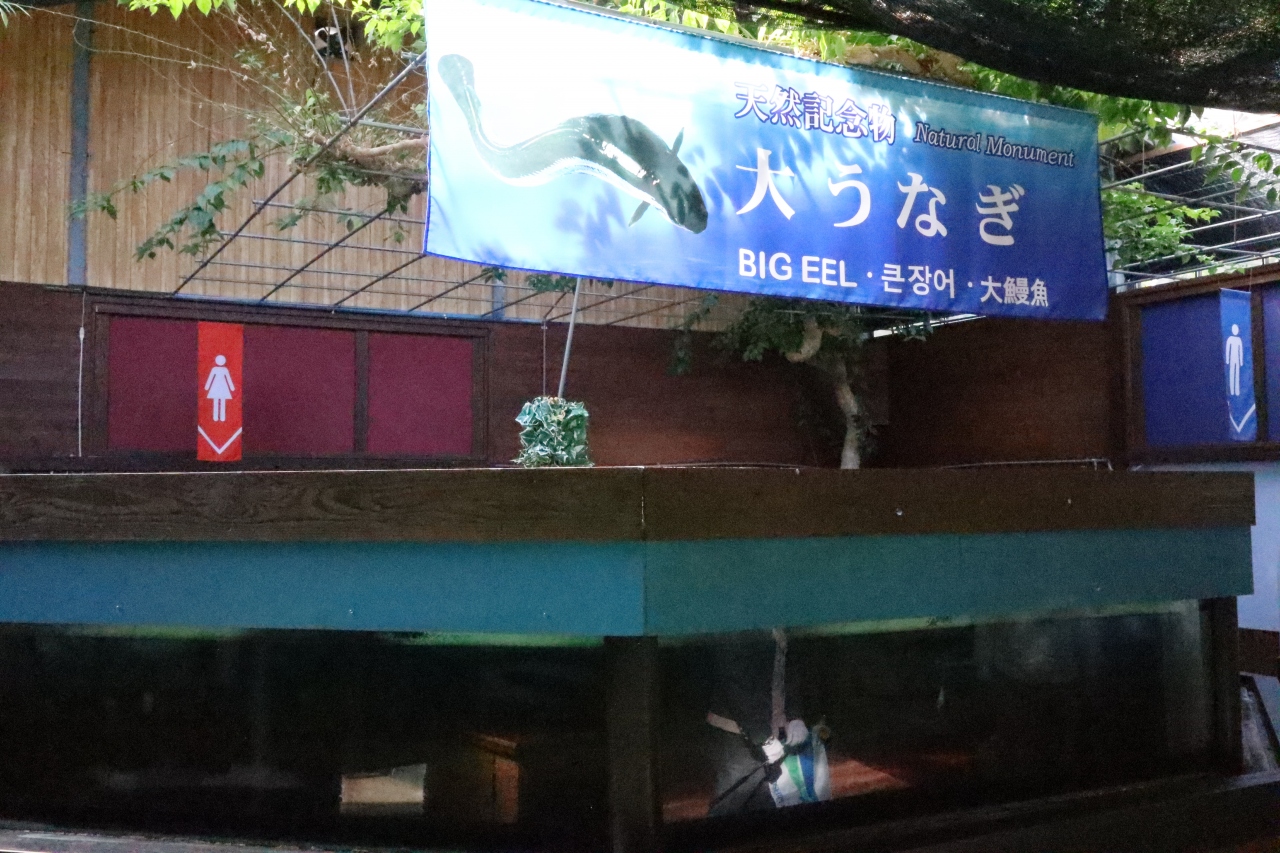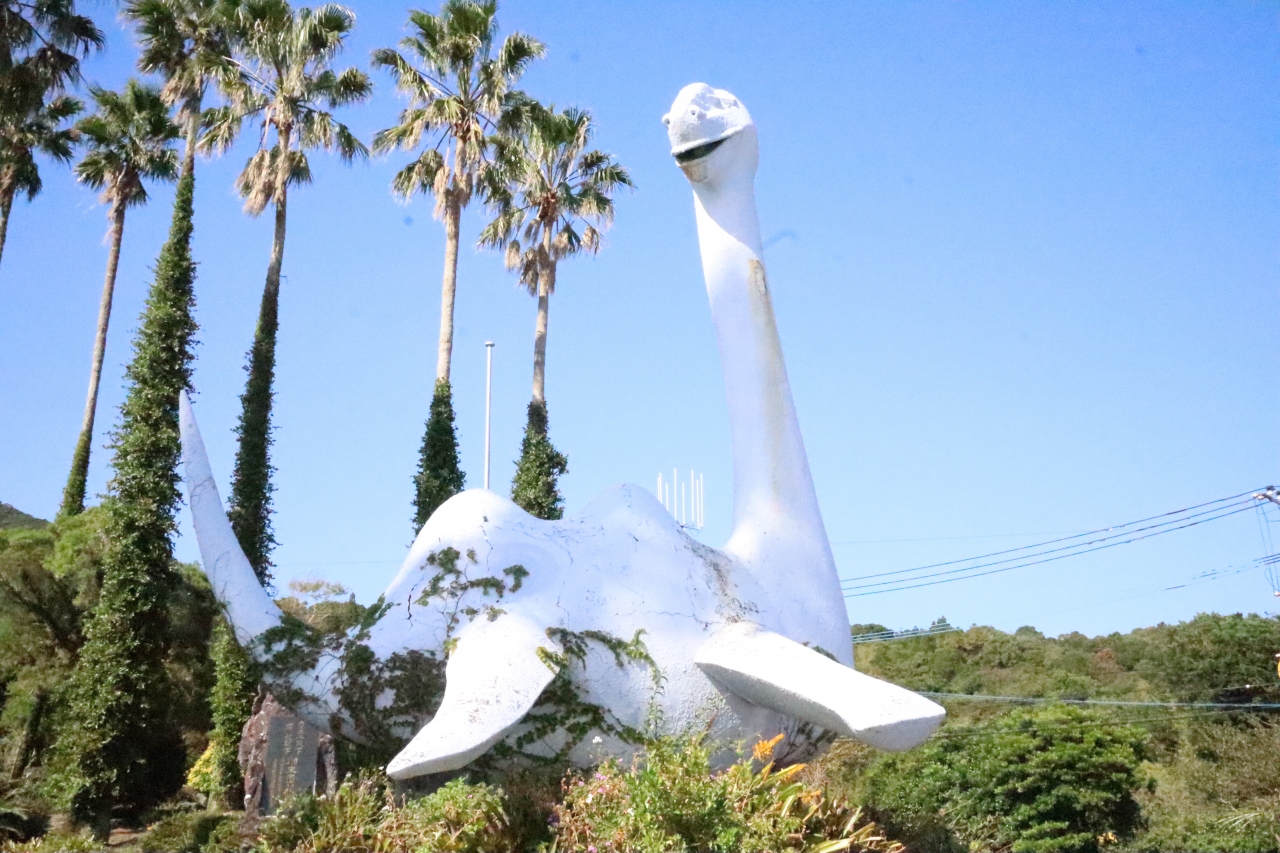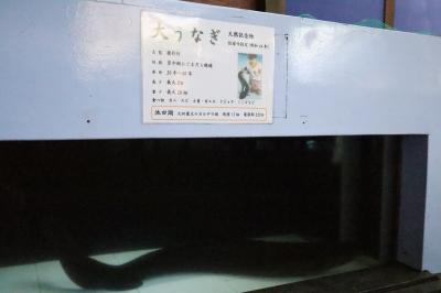 店内を通って一番奥にいる大うなぎを一旦見学して自由行動となります。トイレとタバコ休憩、屋外の白いイッシー像を見上げて池田湖を眺望することになります。春はここら一面に黄色い菜の花が咲き誇ってとてもきれいです。