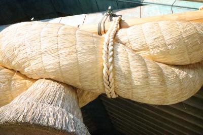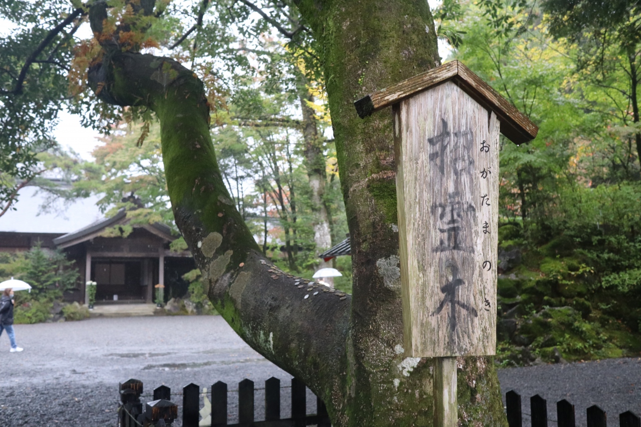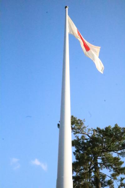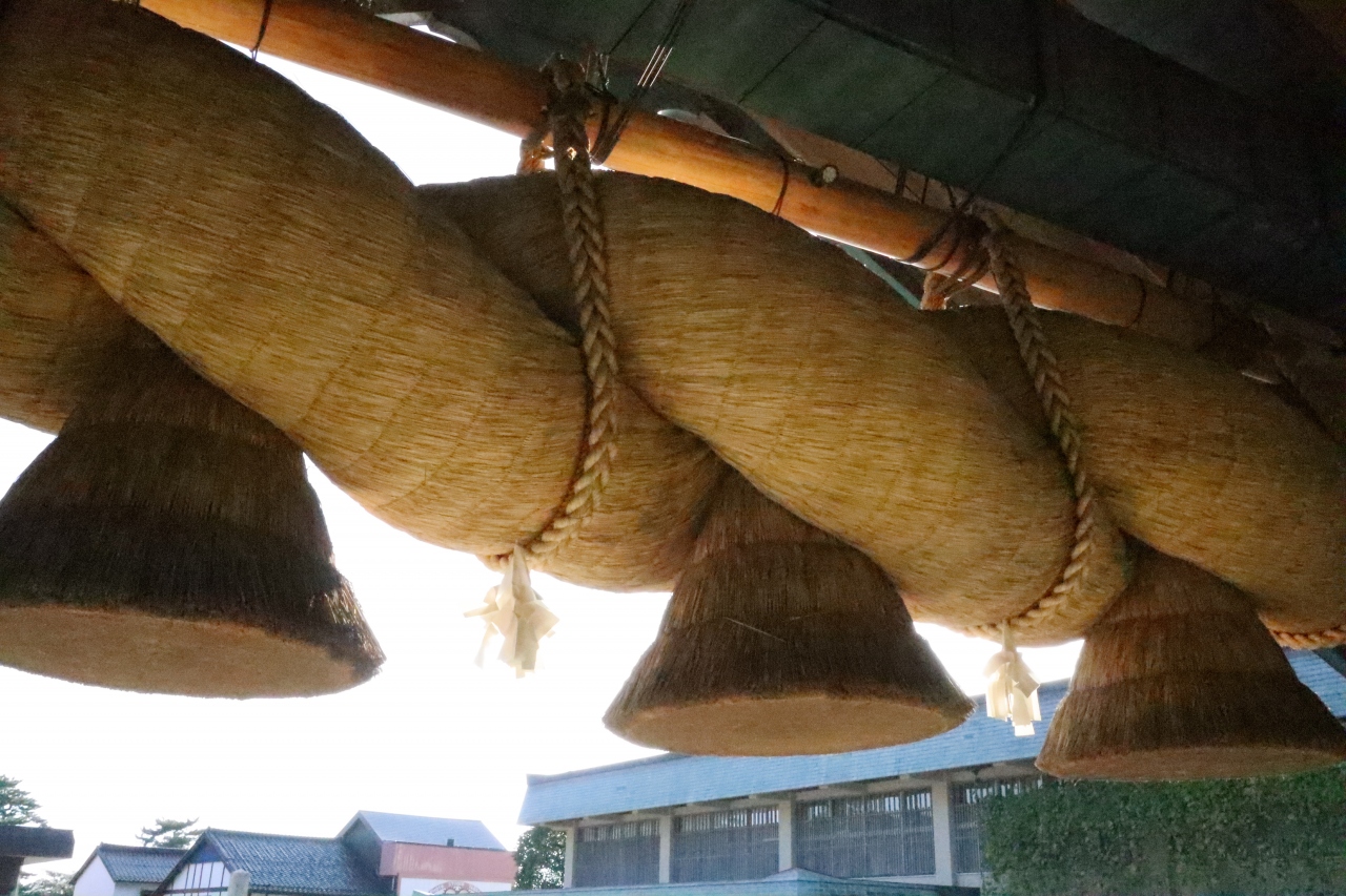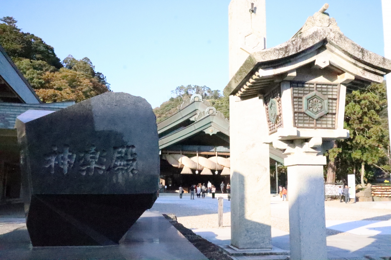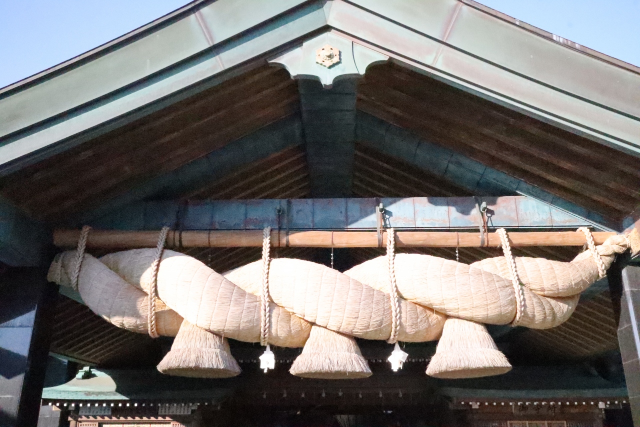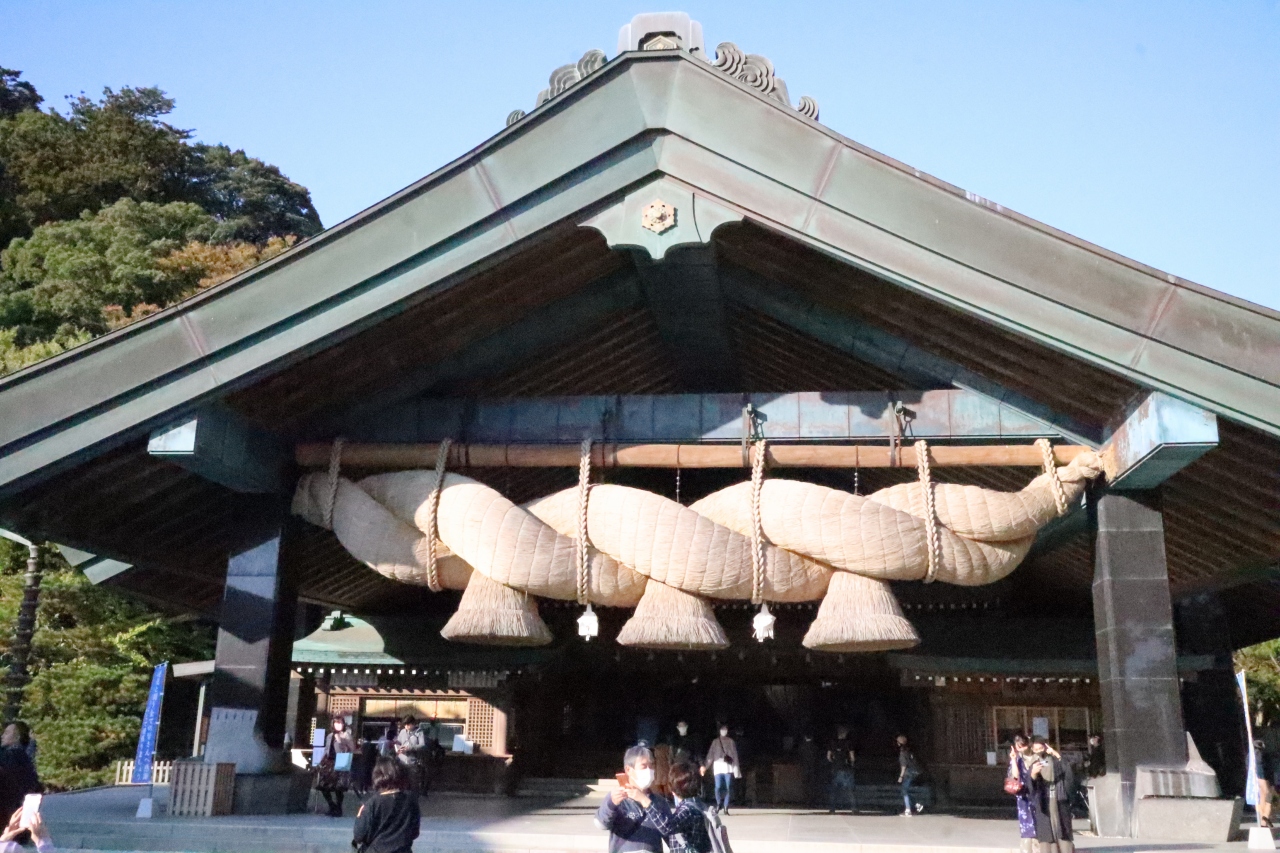 出雲大社の長い参道の突き当りに本殿がありますが、出雲大社では「二礼・四拍手・一礼」の作法で参拝します。その左側に神楽殿があります。出雲大社神楽殿に掲げられた大しめ縄は長さ13.5m、重さ5tと日本一の大きさで圧巻です。またここにある国旗掲揚台はポール高が47mで日本一、掲揚される日章旗は14m×9mあり遠くからでもよく見えます。是非合わせてご覧ください。