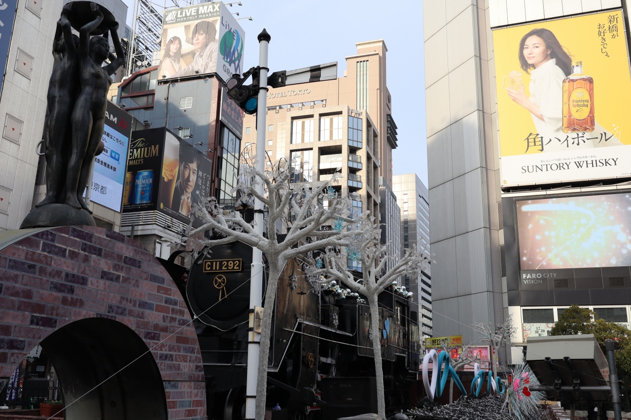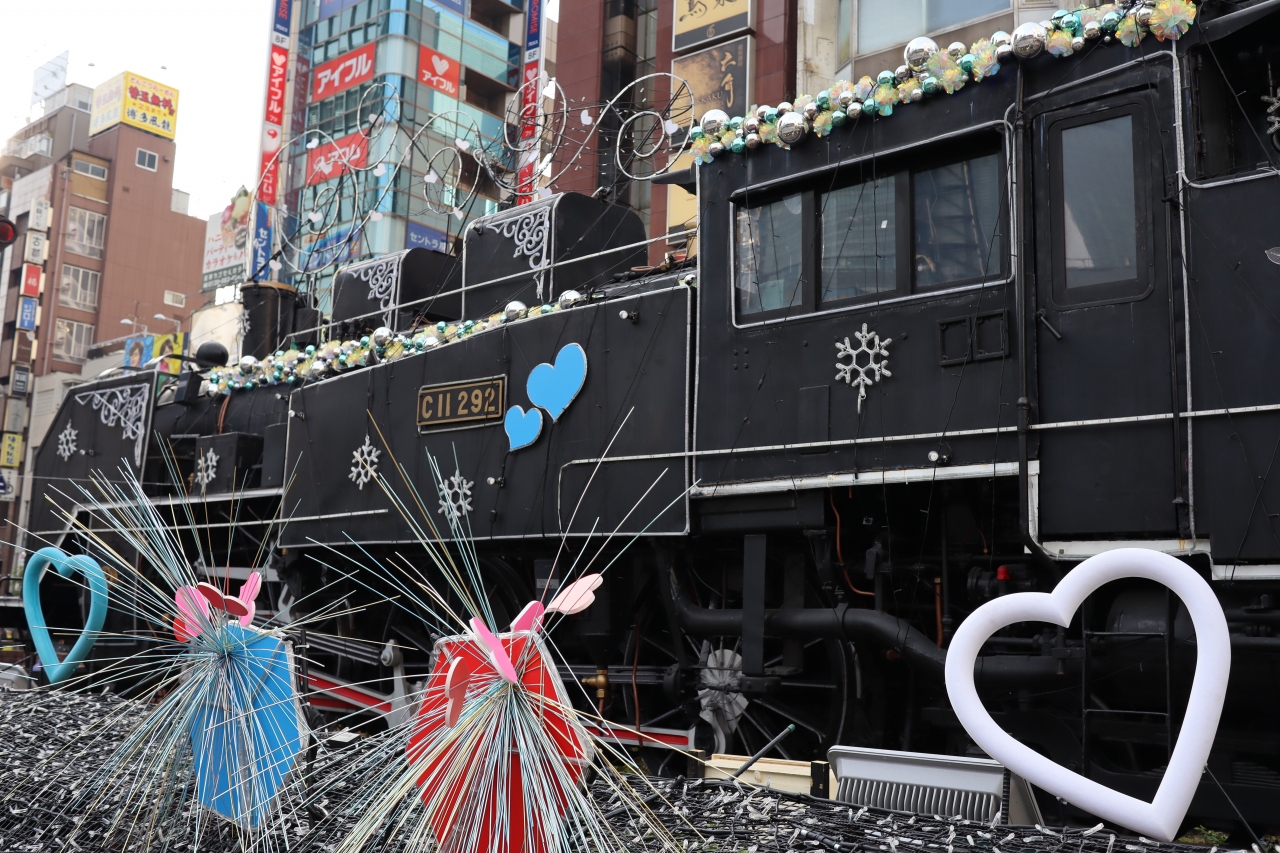 SL機関車は一日三回 12:00、15:00、18:00に汽笛がなります。また、2021年1月9日までエールを運ぶ新橋SLイルミネーションと題して17:00より点灯します。クリスマスまではSL機関車にサンタが乗っていました。SL機関車の隣に設置されている電光掲示板では東京オリ・パラ開催を頑なに信じて、いまだカウントダウンを続けています。