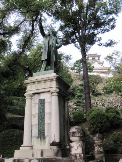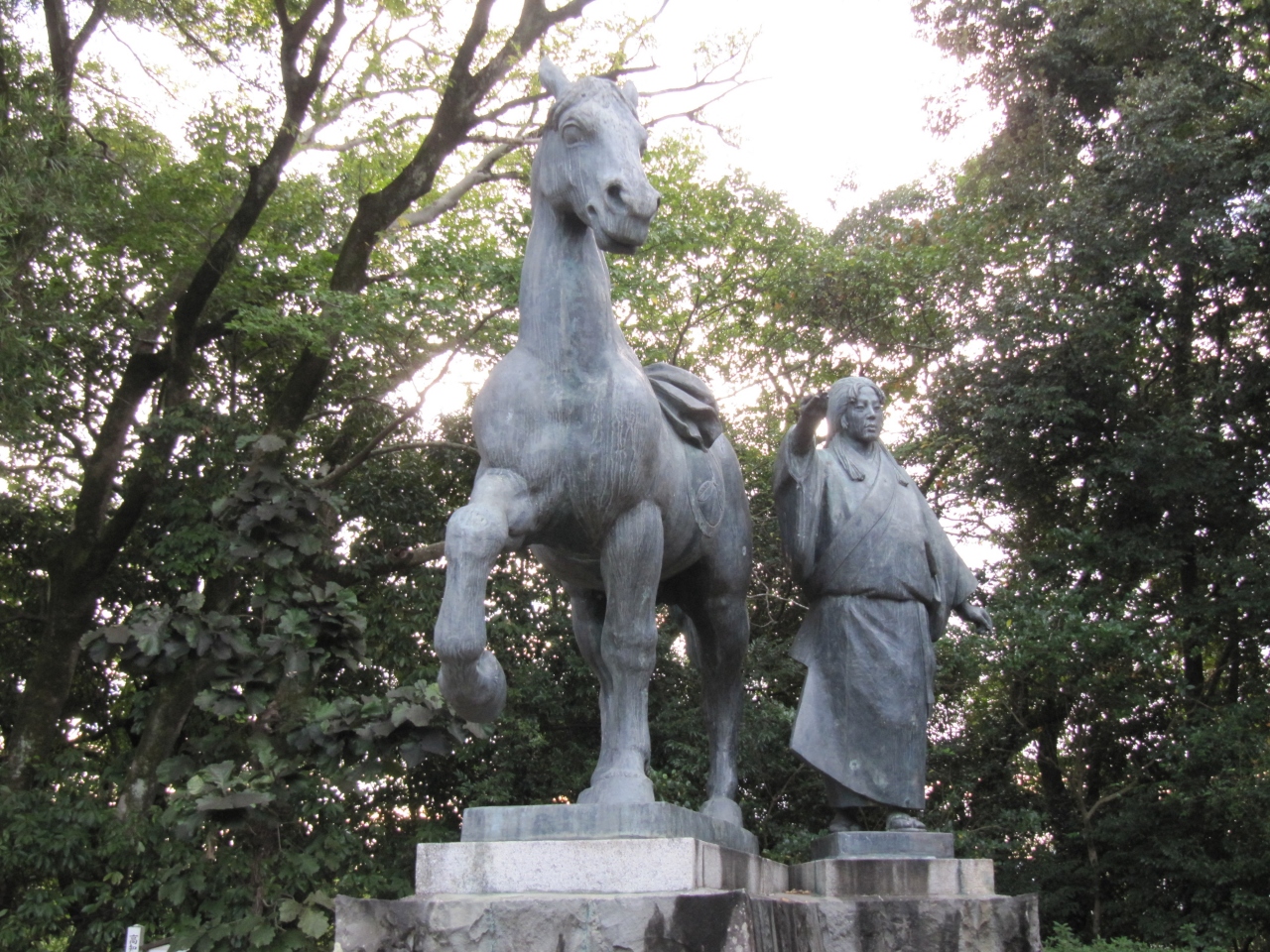 路面電車の高知城前電停が最寄となります。帯屋町商店街からだとひろめ市場を通り越してまもなくです。麓には板垣退助像や高知城を築いた山内一豊像があります。途中には馬を連れた山内一豊の妻、通称「千代」の像があります。