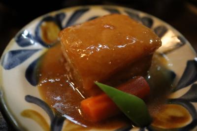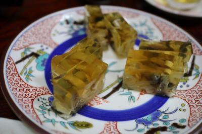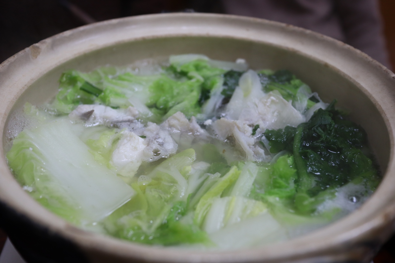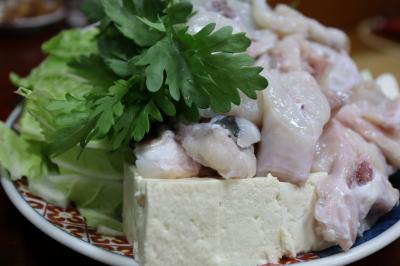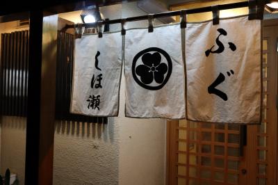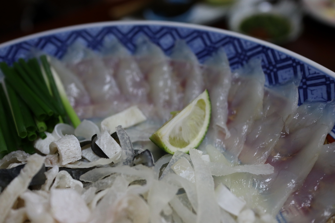 この日はふぐ刺し、ふぐの煮凝り、ふぐの唐揚げ、ふぐ鍋・雑炊のコースにしました。料理コースは三種類あって、このコースは中間の6千円台です。もうひとつ上のコースには白子が付き、一番リーズナブルなコースには唐揚げと煮凝りが付いていません。