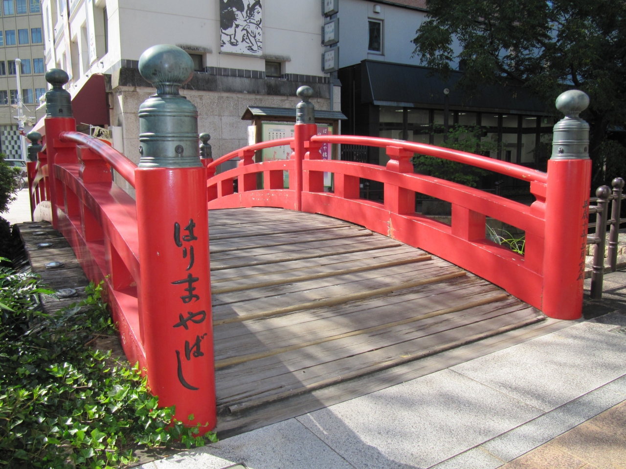 現在、はりまや橋とは高知市内の地名で交通の要所です。場所は高知駅から南に徒歩10分、とさでん路面電車で5分ほどのところに位置します。みなさんが通称がっかり橋という橋は、はりまや橋交差点にある西鉄ホテル裏にある朱色の橋のことを言いますが、そもそもはりまや橋とはその前面に車が行き来する大通りのコンクリート橋のことのようです。