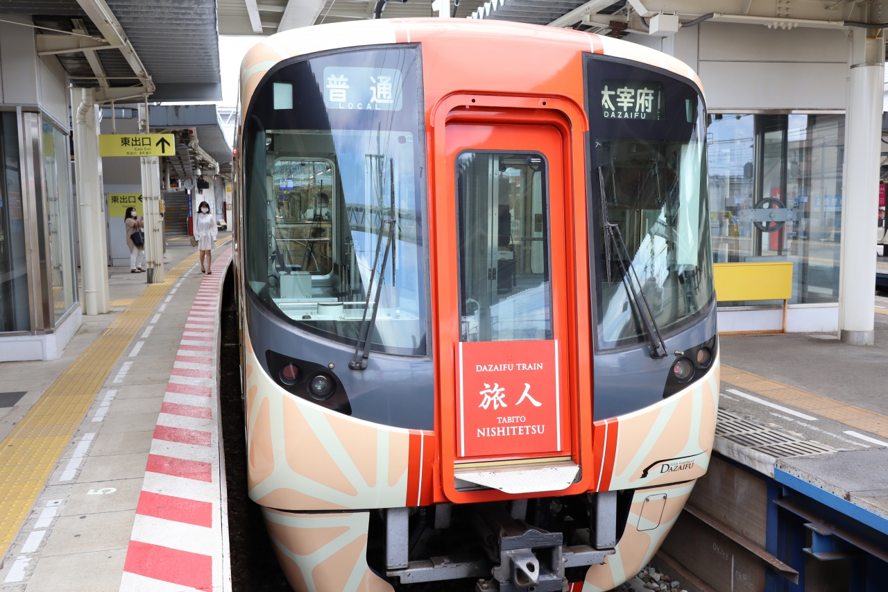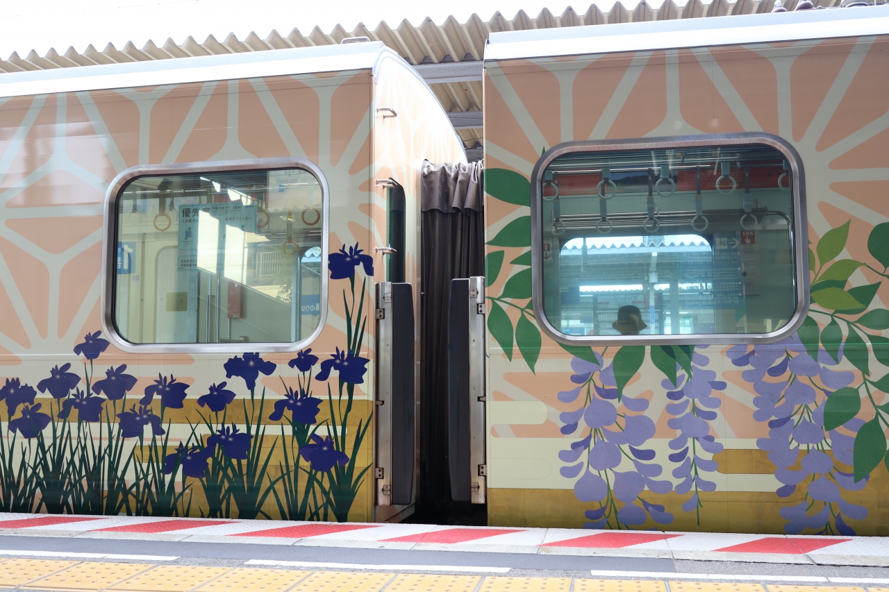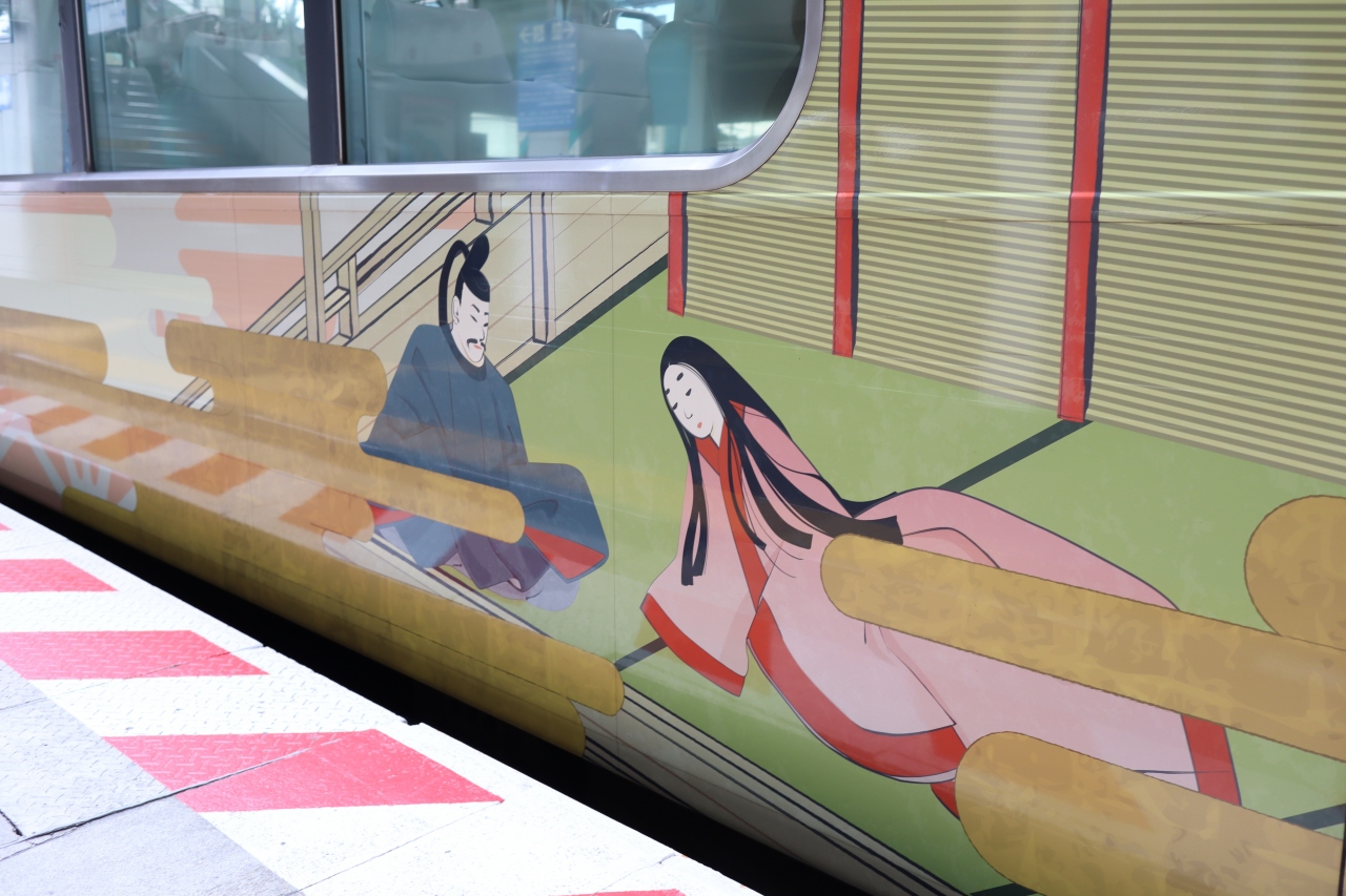 西鉄二日市駅と西鉄大宰府駅の間を走る電車に「旅人」という観光列車があります。車両にいにしえの時代の季節毎の絵巻模様が描かれているというものです。
