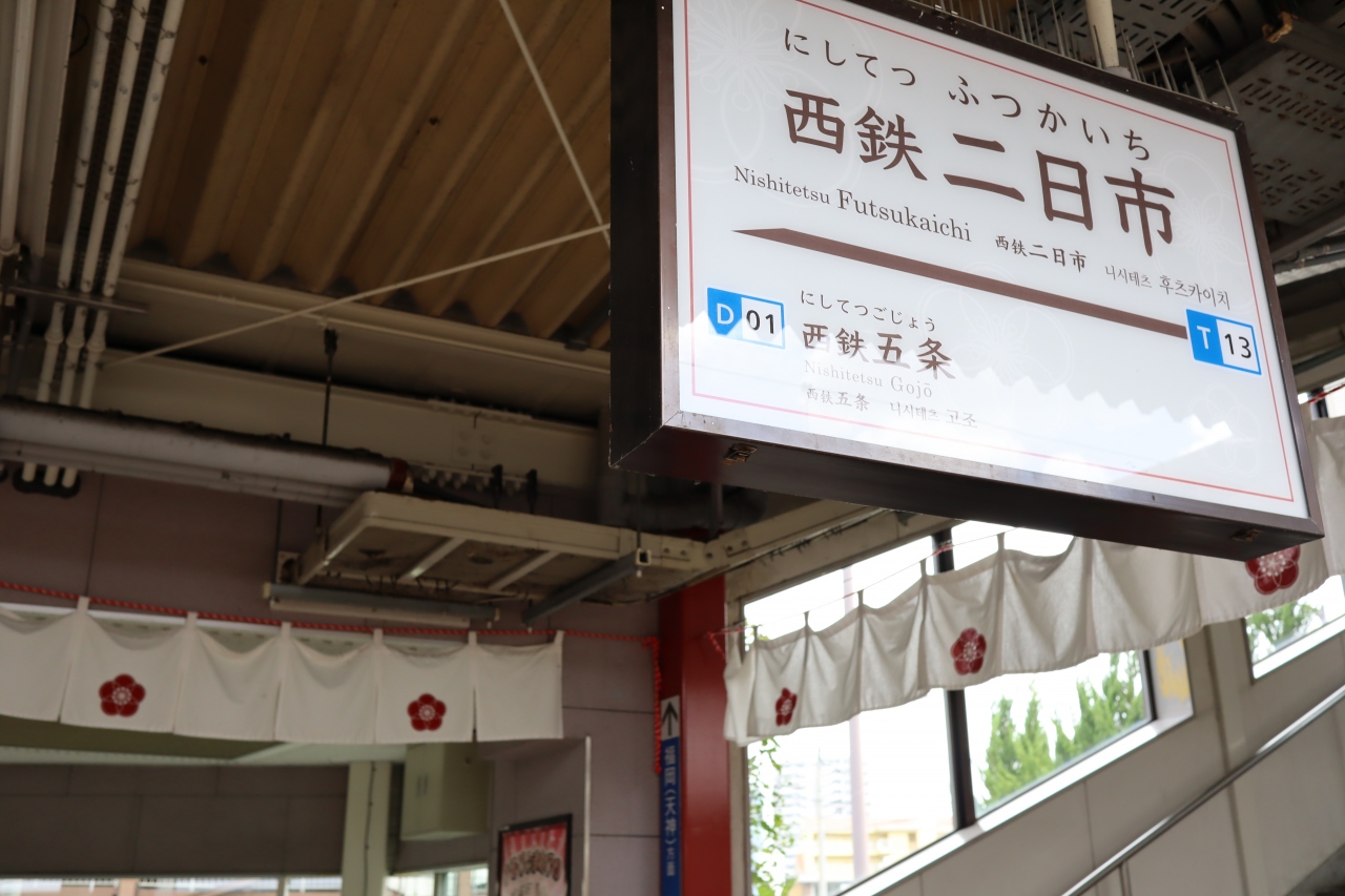 学問の神様、菅原道真公をお祀りした太宰府天満宮への公共交通機関での行き方です。西鉄天神駅から西鉄二日市駅まで特急で16分、西鉄二日市駅でホームを跨いで大宰府線に乗換します。西鉄太宰府駅へは2駅わずか7分で到着します。