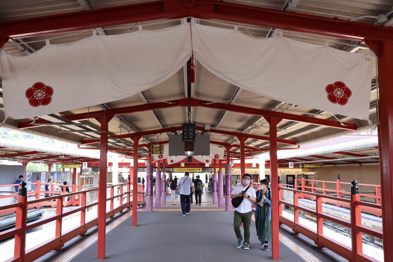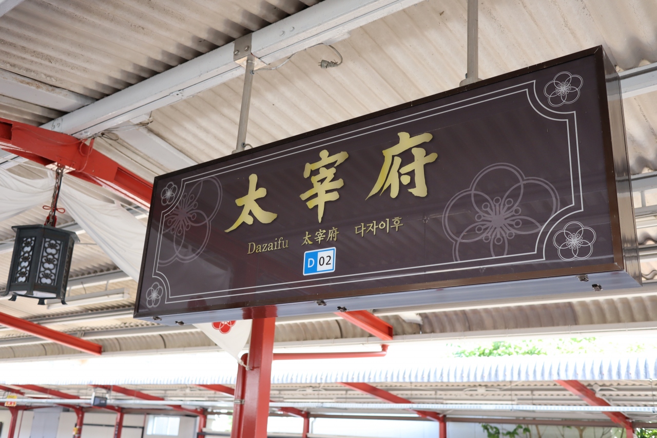 西鉄太宰府駅では梅マークを随所に見ることが出来ます。太宰府天満宮へは駅を出て右にまっすぐ進んだ突き当たりになります。人の流れで分かると思います。- 旅行時期