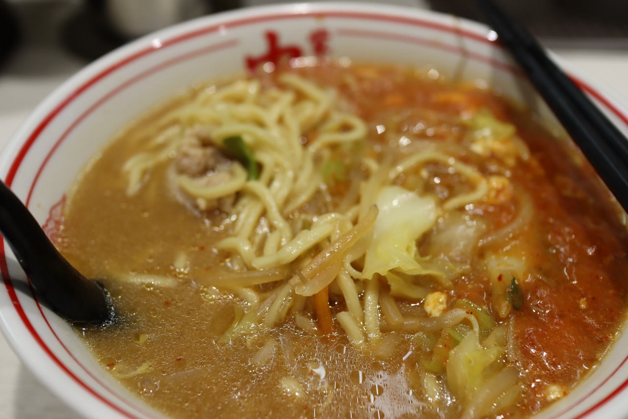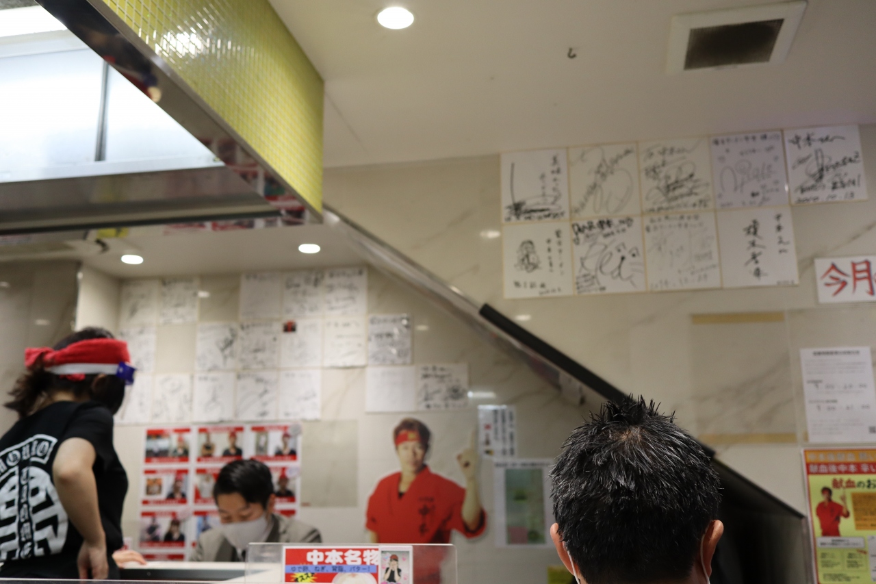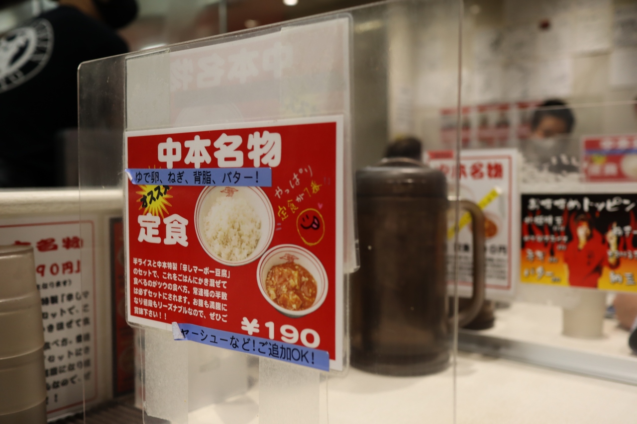池袋駅東口からサンシャイン60通りを少し入ったところに蒙古タンメン中本の赤い看板、この日は気温も低く温かいものというか辛いものが無性に食べたくなり入店。一階の店内は想像以上に広いですが、日曜の昼ということもあり結構お客さんが入っていました。