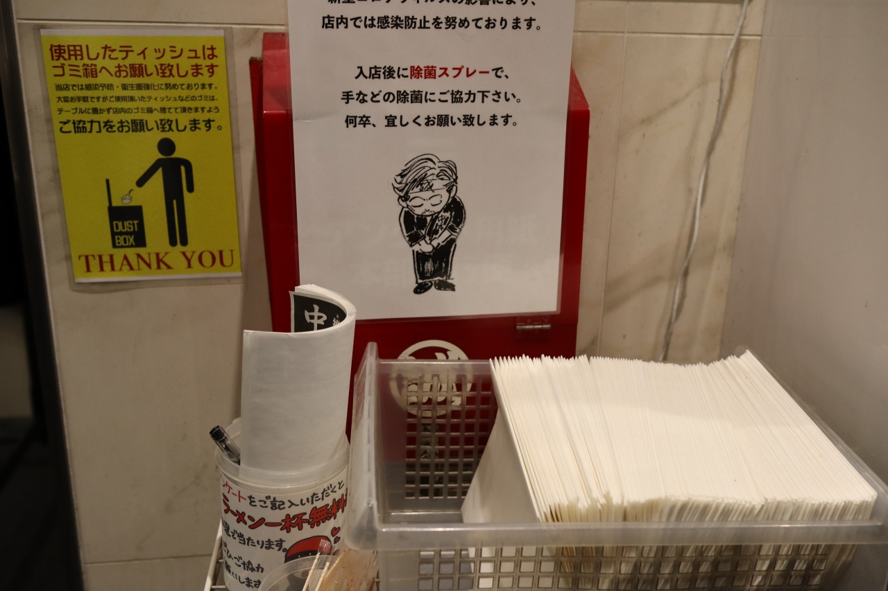 自販機の横に紙エプロンがあるのでスープのハネが怖いとき利用できます。カウンターにはアクリル仕切り板が席ごとにあり新型コロナ感染対策されています。- 旅行時期