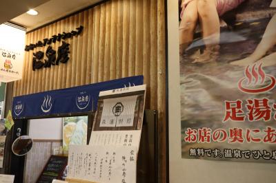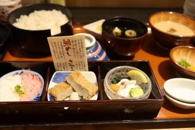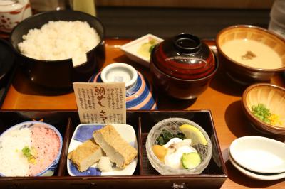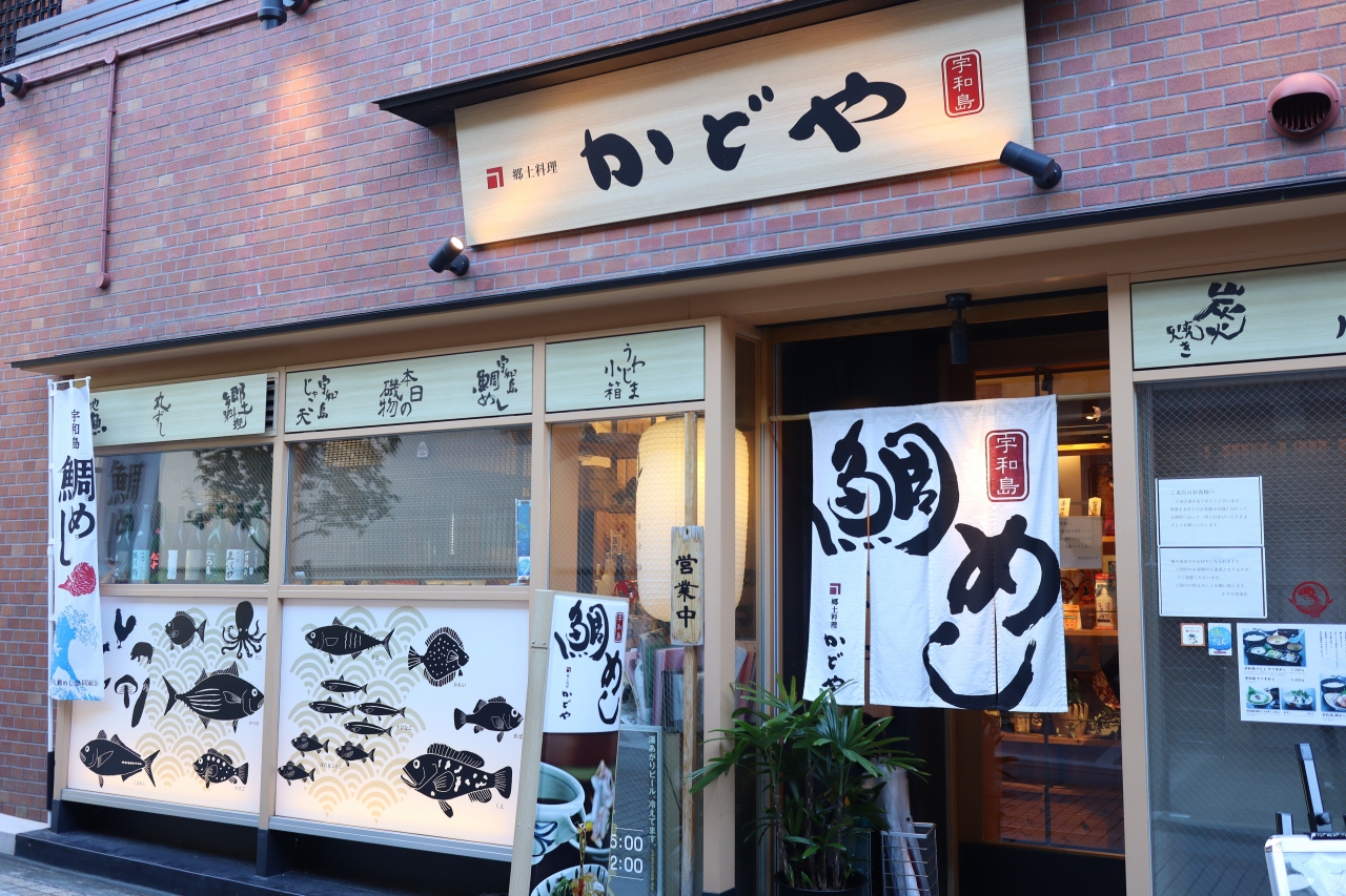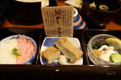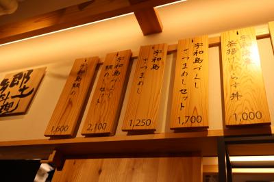 道後温泉「椿の湯」の目の前。宇和島鯛めし料理「かどや道後店」で夕食です。宇和島づくしさつまめしセットは、さつま汁、じゃこ天、鯛などの郷土料理。鯛めし・さつま定食の食べ方のしおりが付いてきます。お風呂上りに一杯もオツだと思います。