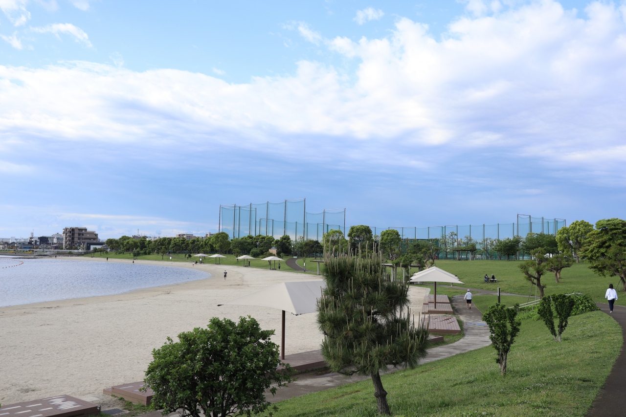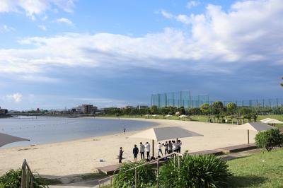 平和島の平和の森公園から環七をくぐって南側に続く公園広場、海苔のふるさと館の先にある浜辺橋を渡ると、南国ビーチのような人工浜辺があります。夏場は日光浴をしている人も多く、かと言って観光地ではないので密集するようなことはありません。