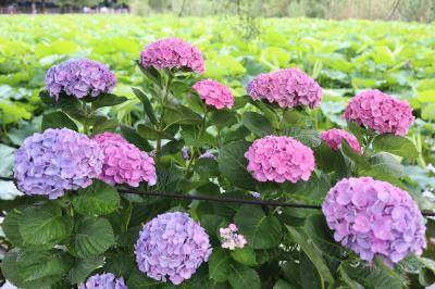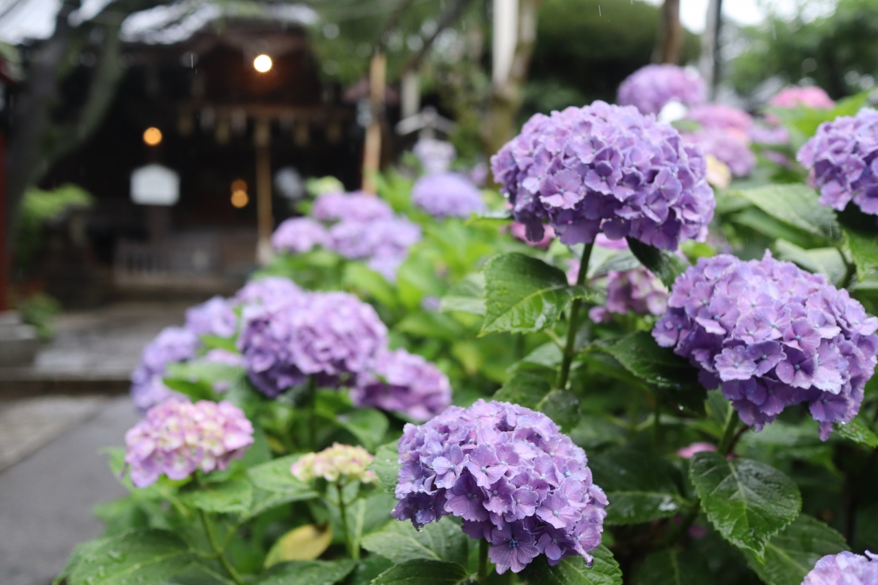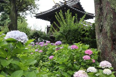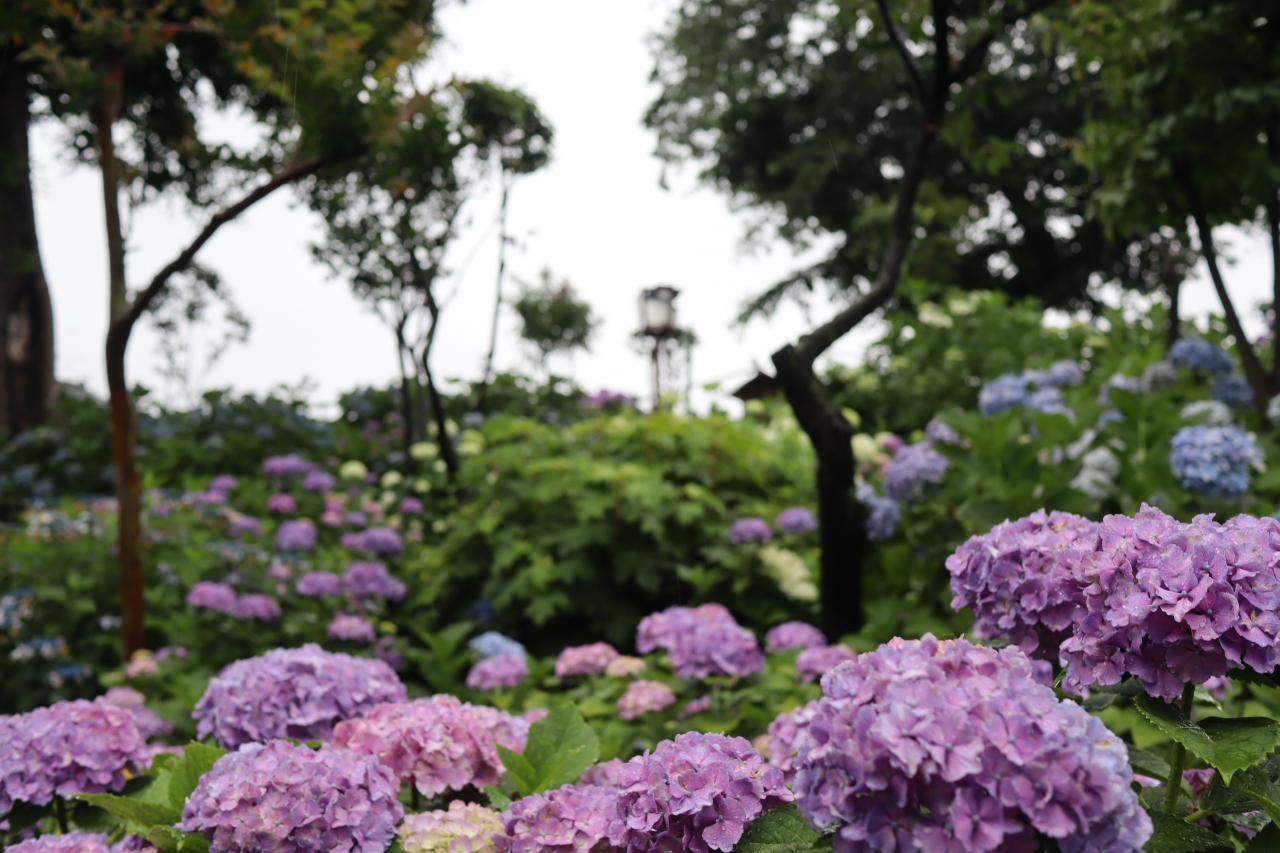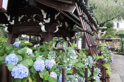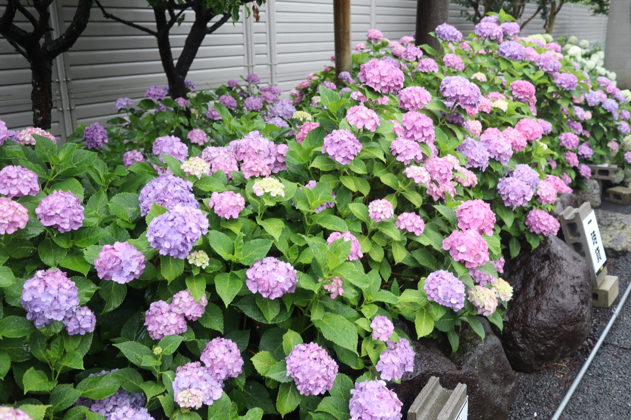 上野・日暮里から京成本線で数駅目の堀切菖蒲園駅で下車。出口は一ヶ所、大通りを左に折れて案内表示を頼りに路地へ進んでいきます。住宅地の間を通っていくと、左右どの家にもこの時期はアジサイがいっぱいです。最寄り駅から徒歩8~10分程度で着きます。