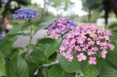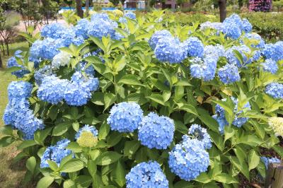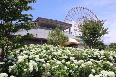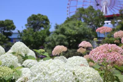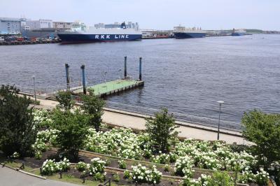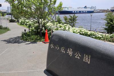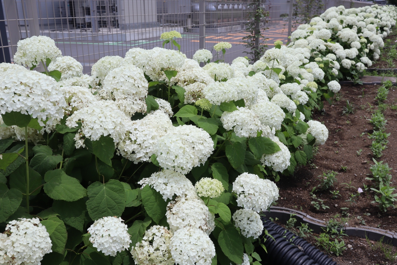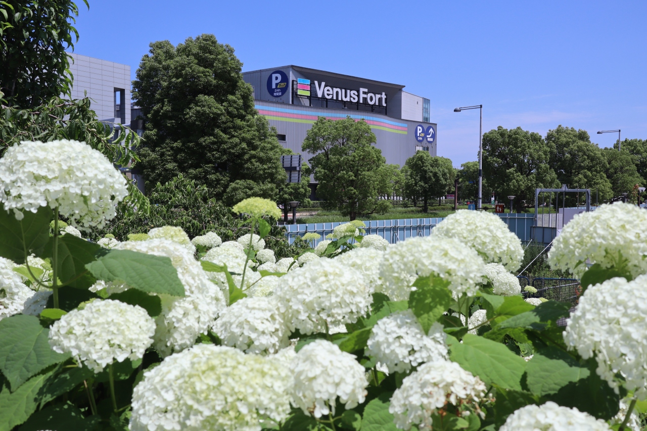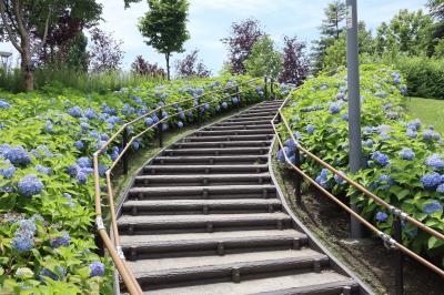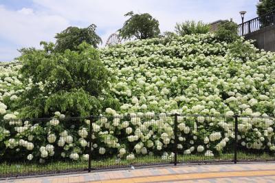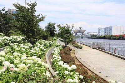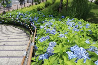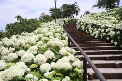 お台場臨海副都心、東京テレポート駅からガンダムまでの間に広がるあじさいロードは意外と知られていない穴場かもしれません。出会い橋の近くの斜面には一面に咲き誇る白いあじさい、階段を挟んでたわわに咲く青いあじさいは6月中旬が見頃です。