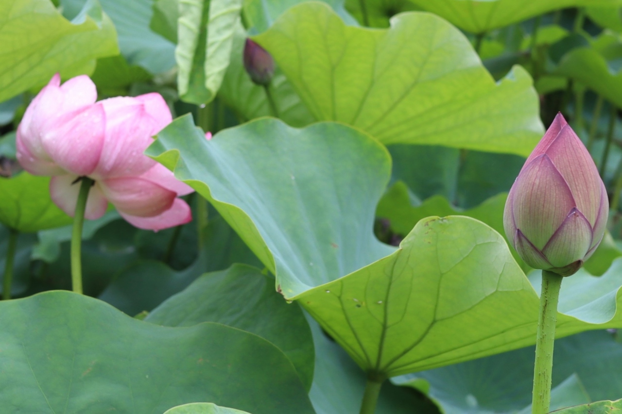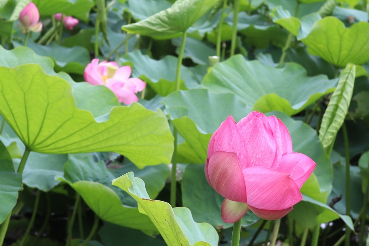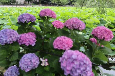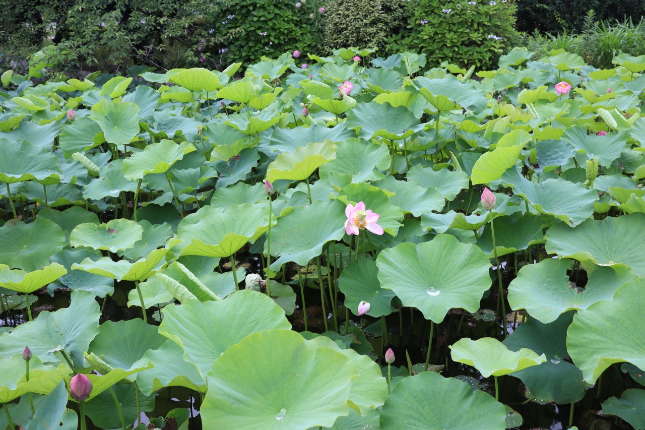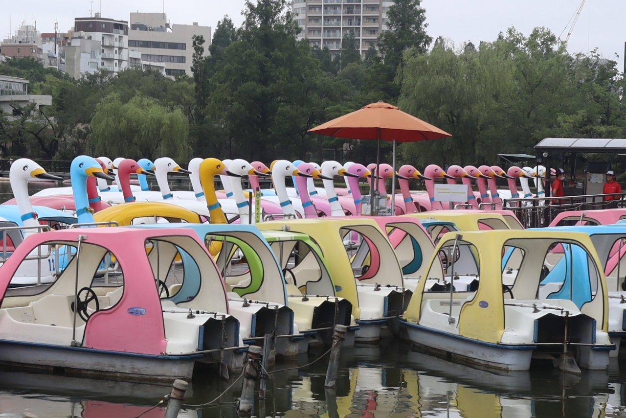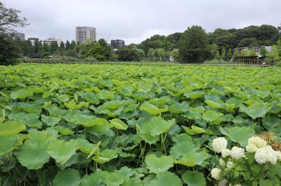 上野恩賜公園の桜並木から石階段を降りていくと不忍池です。弁天堂へ続く歩道の左右池がびっしりとハスの葉に覆われています。訪れた6月下旬にはすでにちらほら花が咲いていました。
