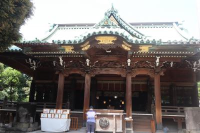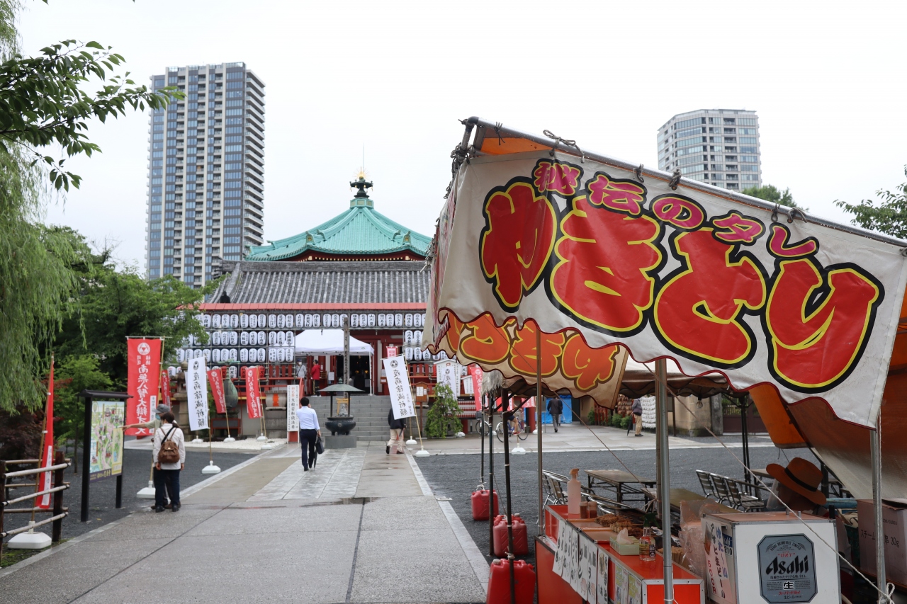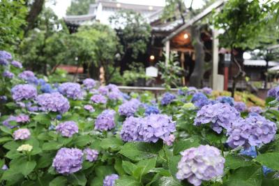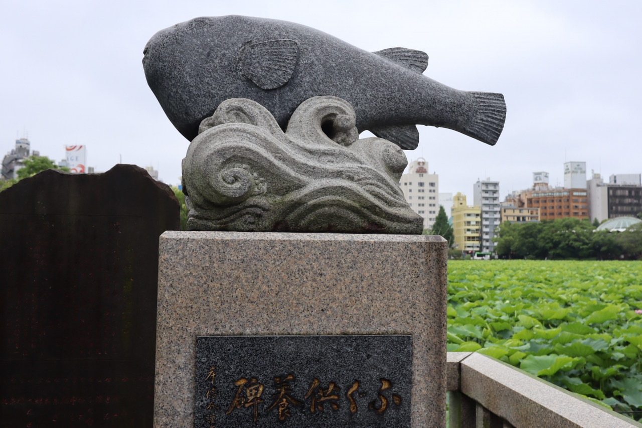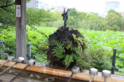 弁天堂は不忍池に浮かぶ島のような場所にあります。歩道脇にはあじさいもありました。手水舎、ふぐ供養碑、めがね之碑を見て弁天堂へ。裏手には包丁塚も。たくさんの提灯には数々の著名人の名前もありました。