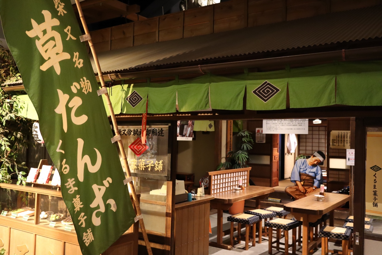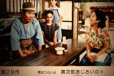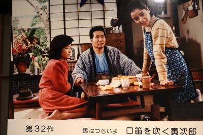 そこから徒歩5分ほど江戸川方面に歩くと寅さん記念館。まず入口には映画製作の現場スタッフ紹介、続いて、草だんご屋「くるまや」の撮影セット。撮影スタジオ「くるまや」は実際のセットを大船撮影所から移設しているとのこと。全49作の内、幾つかの懐かしい写真があちらこちらに掲げられています。