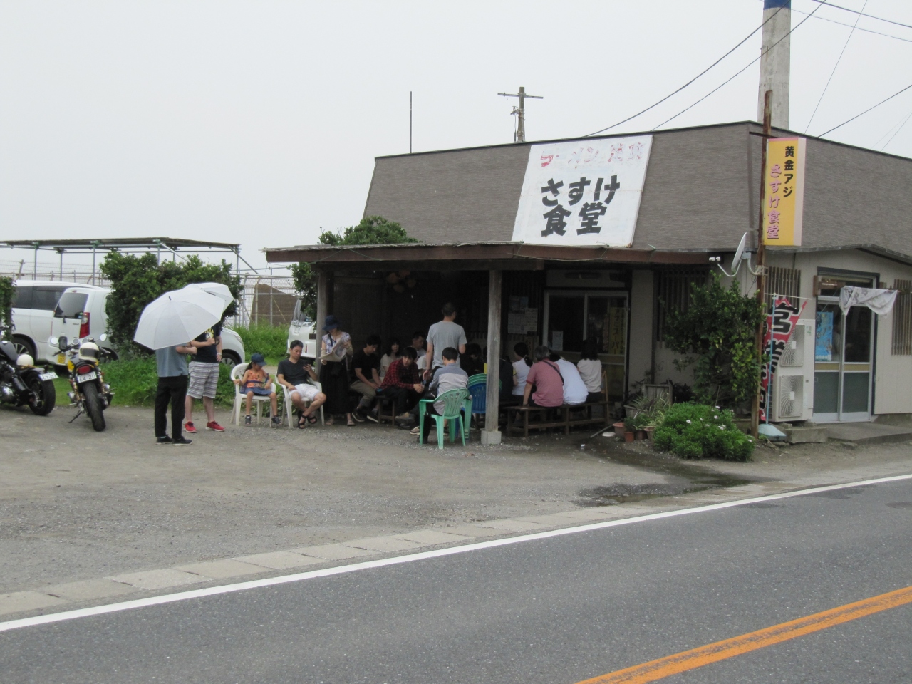 東京湾フェリーで久里浜港から南房総の金谷港に着き、幹線道路を鋸山の方に歩いていくと、途中右側に行列必死の「さすけ食堂」があります。開店10時にも関わらず多くの人が受付表に名前を書いて順番待ちしています。
