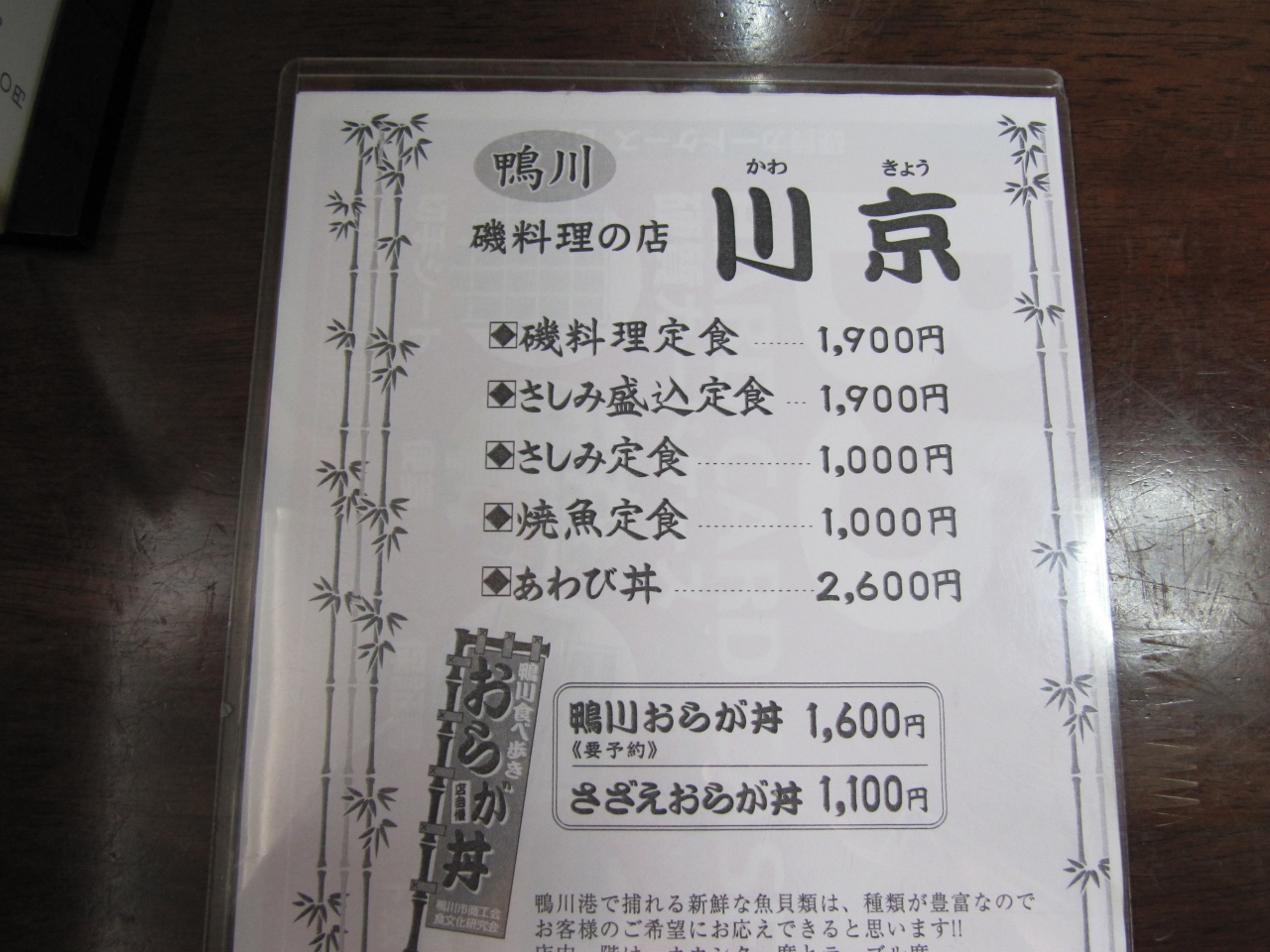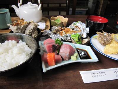 千葉県房総半島の安房鴨川駅から徒歩3分、昼食で川京に寄りました。超ド級のお刺身、天婦羅、サザエ、蒸し魚、酢の物、ところてん、お漬物、ごはん、味噌汁がセットで言うことがありません、とても美味しかったです。但し、多くのクチコミにもありますように、なにせ老夫婦のお二人?のためか料理が提供されるまで時間を要しますので必ず想定内として訪問されてください。私の場合も席についてから30分以上待ちました。しかし、そのようなことですから店頭行列待ちはなく、暑い夏の時期にさっと入れてゆったり涼めて良かったです。- 旅行時期