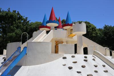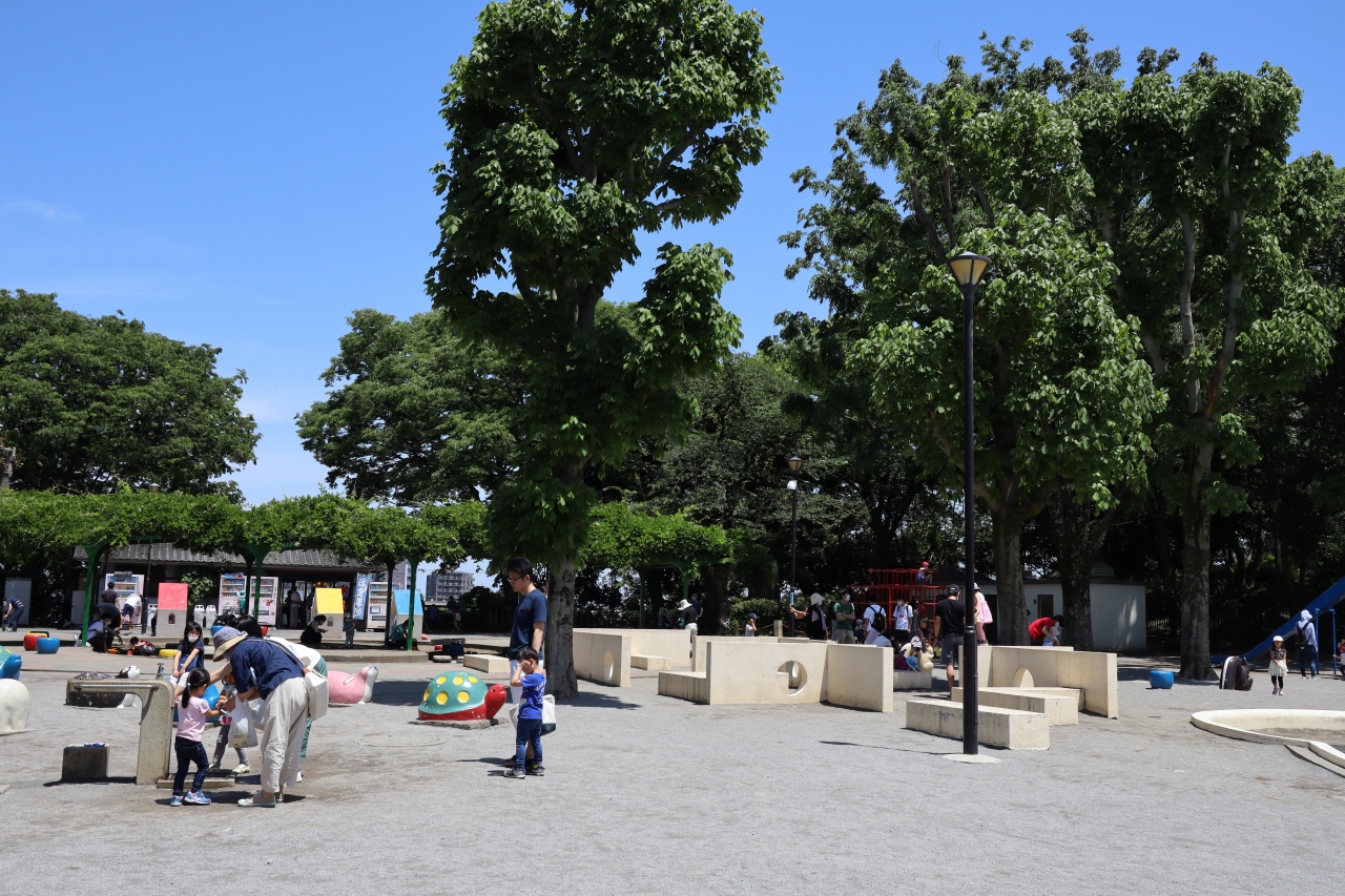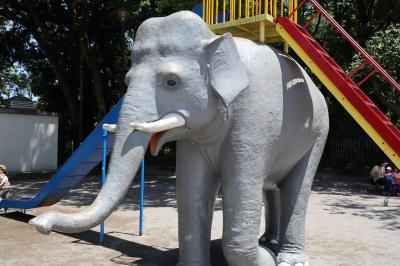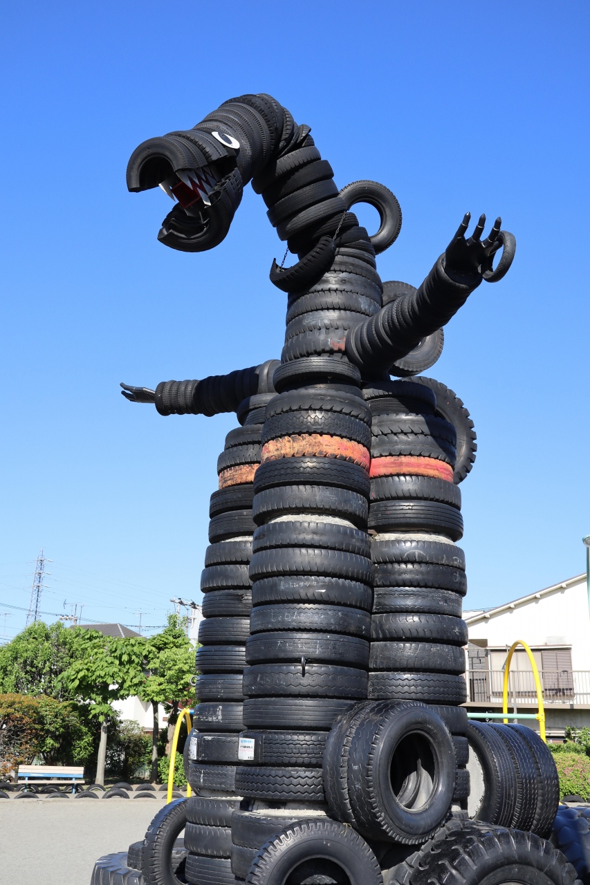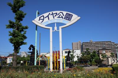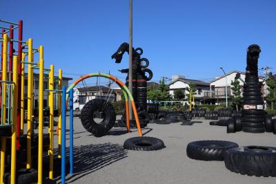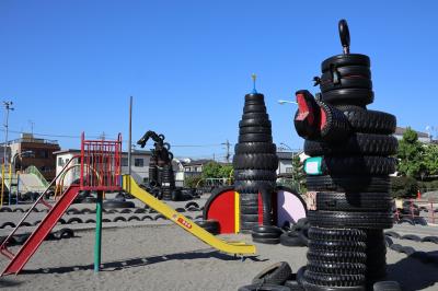 JR京浜東北線の蒲田駅から線路沿い右道路を南へ行くと西六郷公園(通称タイヤ公園)があります。ダンプカーのタイヤでしょうか、大きなタイヤがゴロゴロあって、タイヤで製作された怪獣がいくつかあります。ジャングルジムやブランコなどの遊具に砂場もありました。