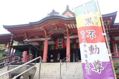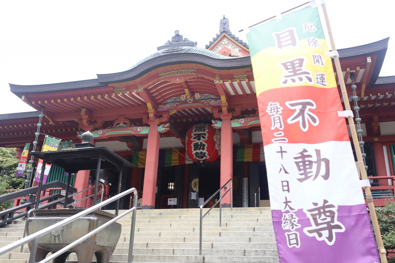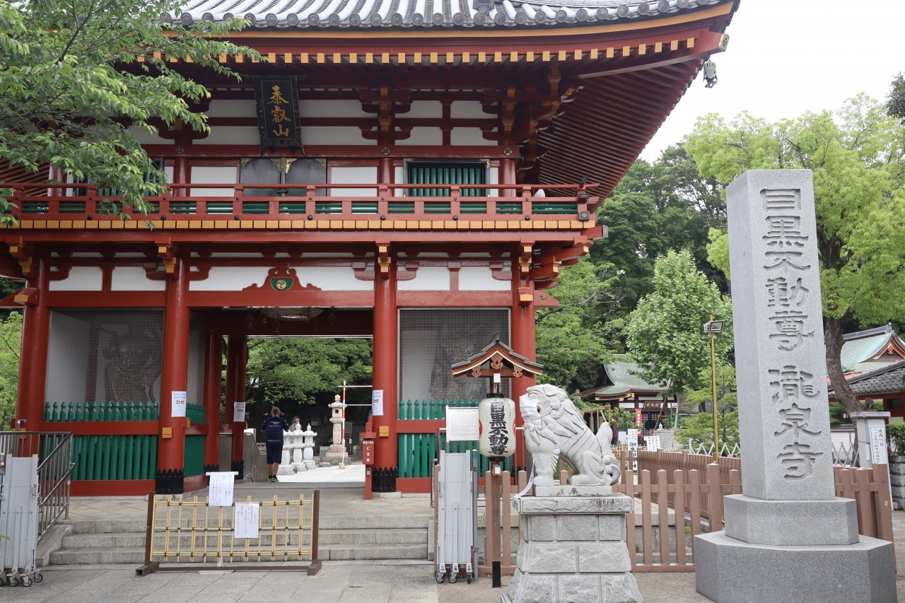 JR目黒駅から行人坂を下り、左に目黒雅叙園を見ながら目黒川を渡ります。しばらく道なりに行くと山手通りの目黒不動交差点。その先、紀伊国屋書店本社の横に参道入口があります。少し古びた参道商店街の先の右側です。山手七福神のひとつにもなっています。