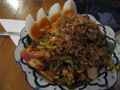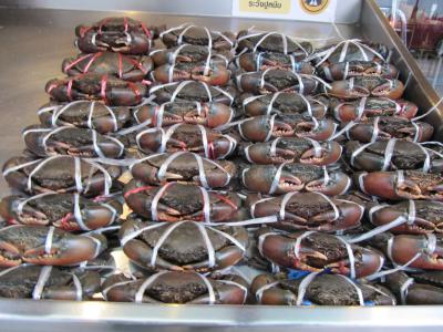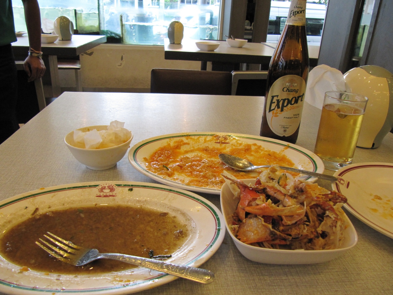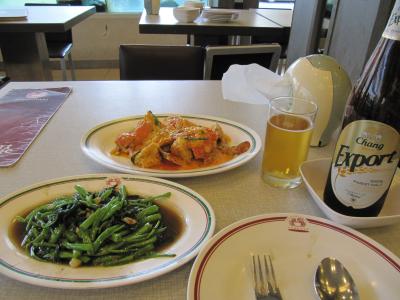 カニは殻付きだとカニ肉を外しにくく、手がベタベタになってイライラするはずですので、注文の際「ヌア」と言ってあらかじめ殻からカニ肉を外してもらう方がいいと思います。あと、空心菜は東南アジア共通に美味しいです。ビールが進みます。