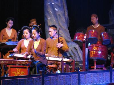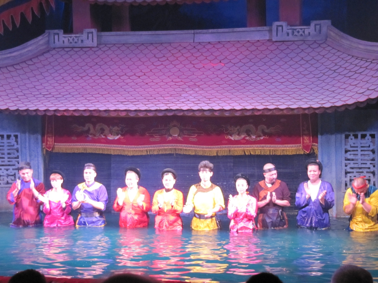 ホワンキエム湖のほとり、青い建物の中に水上人形劇があります。エアコン冷房が効いています。音楽と共に始まりまずは演奏者の紹介があります。それから人形劇が厳かに始まります。