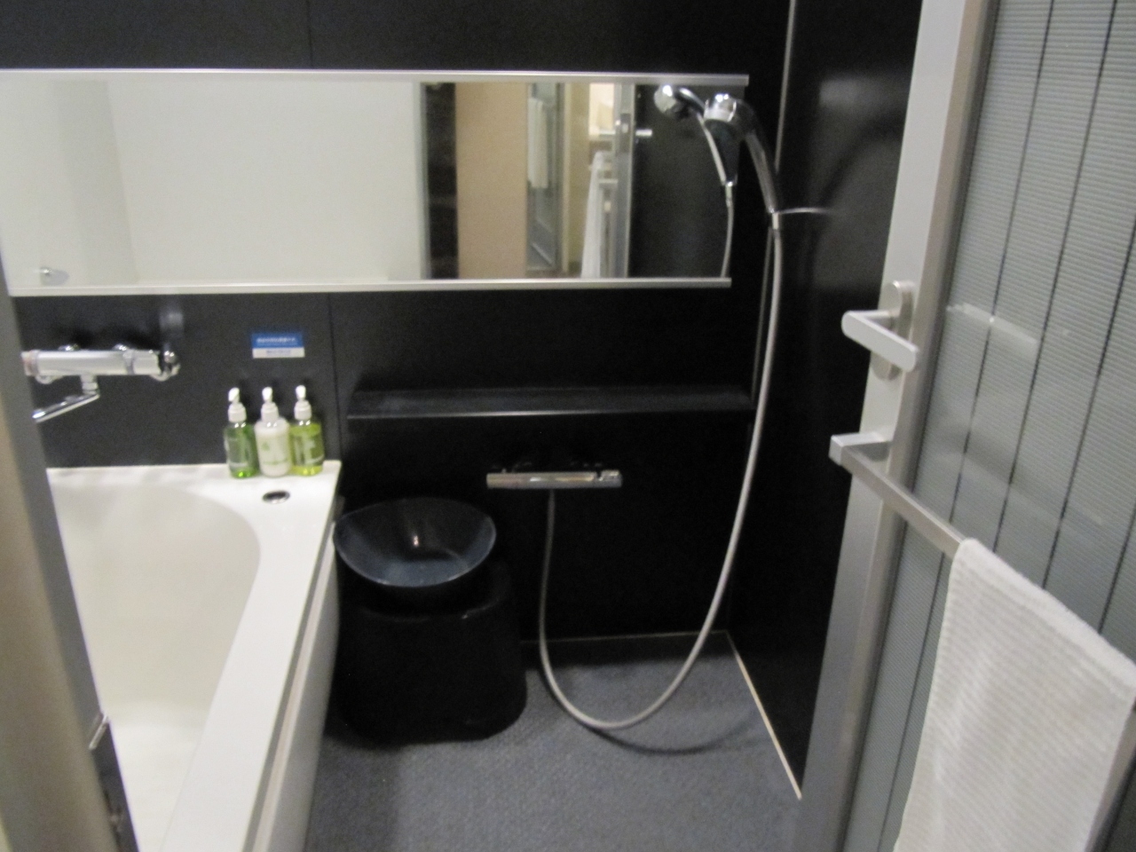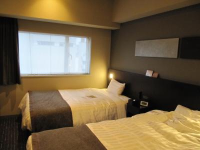 広島市中心部の八丁堀交差点から徒歩3分。フロントは4階です。夕方の時間帯だったせいか受付で順番待ちの札を渡され15分ほど待ちましたが、たまたまツインのシングルユースにアップグレードしていただいたので気持ちよくお部屋へ。洗い場付きのユニットバスでトイレは別に扉付きでありました。