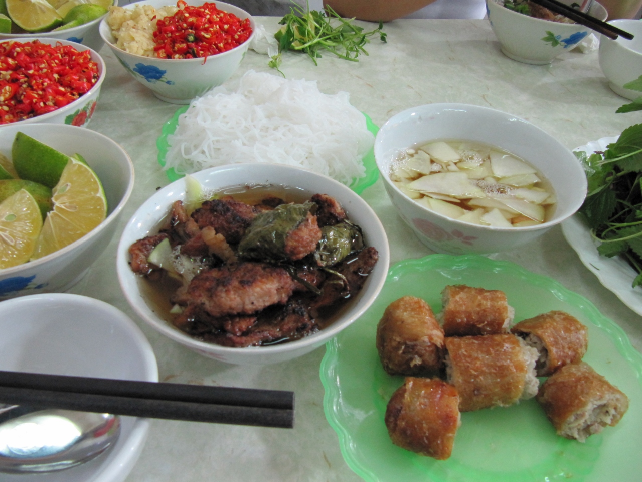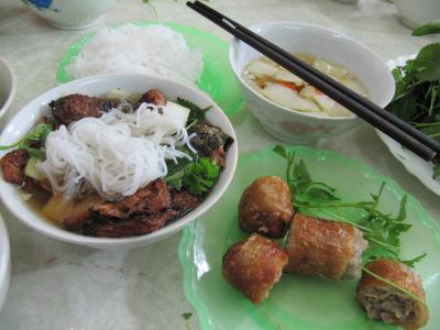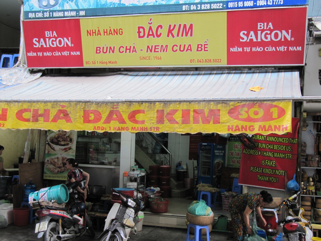 ハノイ中心部ホアンキエム湖の近くで宿泊、旧市街ブンチャーダッキムまでは徒歩ですぐです。赤と黄色の看板です。店頭で豚バラを炭火焼してて良い香りがします。ブンという米麺と炭火焼肉、肉団子を香草野菜と一緒にヌクマムという甘じょっばい魚醤ベースのたれにつけて食べます。ベトナムではフォーやチャーカーも有名ですがブンチャーはお腹と脳を満足させてくれます。多少、観光客料金でも地元の人も多く来ていて明朗会計ですので安心です。