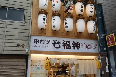 天神橋筋商店街の四丁目と三丁目の境目で地下鉄堺筋線扇町駅の近くです。串カツの七福神は別にJR天満駅の近くや天神橋筋五丁目あたりにも店舗がありますがここは混雑さを感じません。店内は明るくカウンター席のみですが隣とは仕切り板があって感染予防もバッチリで加えて明朗会計です。入店しやすいのか女性のお一人様も見かけました。串カツをお願いするとそれから衣を付けて揚げてくれます。カウンターがいっぱいの時は外の席もあるようです。