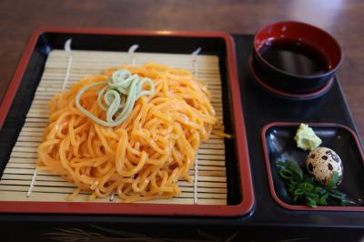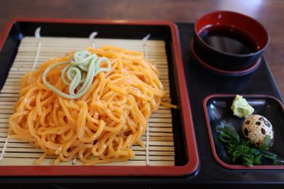 法隆寺観光を終えて南大門に戻ってきたとき一番近いところにある店舗です。「法隆寺名物 柿うどん」というのれんが目に入り気になり注文しました。何とオレンジ色のそばがウズラの卵と共に運ばれてきました。目をつむって食べてみると普通にそばでした。炎天下で疲労した体にエアコンが効いた店内は天国のように感じました。
