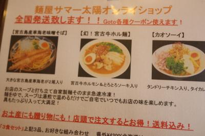 宮古島の中心部平良下里「麺屋 サマー太陽」はラーメン日本一決定戦で全国6位の実績があります。この日は11:00の開店からまもなくして訪問しましたがコの字状の10席カウンターはすでに満席で店頭にて若干の行列に並ぶことに。外観から想像する以上に店内は広く食券制、有名芸人の色紙もありました。日曜定休日ですので要注意。