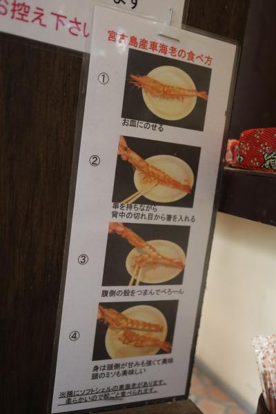 宮古島産車海老の濃厚!味噌そば(税込1,200円)か、宮古牛ホル麺(税込1,200円)の何れにしようかと前日から悩んでいたもののこの日は宮古牛ホル麺が残念ながら売り切れ。名物の車海老の濃厚味噌そばを食券機で購入。車海老の食べ方は説明書きが貼ってあります。濃厚なエビ出汁スープはとても旨く、思わず飲み干してしまいました。- 旅行時期
