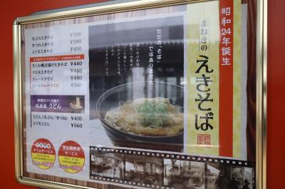 JR姫路駅の在来線ホームには上り下りともに「まねきのえきそば」というお蕎麦屋さんがあります。えきそばというのは麺が中華麺、白い細麺でダシスープもおいしいです。天ぷらえきそば、きつねえきそば390円、きつねうどん400円など破格です。おいなりさんや助六とのセットメニューもあります。写真は「天ぷらえきそば」です。