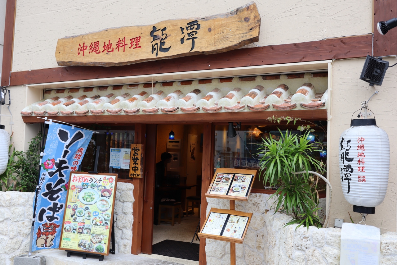 那覇国際通りに面した沖縄地料理 龍潭 国際通り本店。場所的には県庁北口の国際通り入口から歩いて10分くらいでしょうか。松尾の交差点の手前左側です。ランチで寄り、メニュー表のトップにデカデカと写真が載っていた「あぐー肉そば定食」をいただきました。