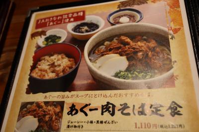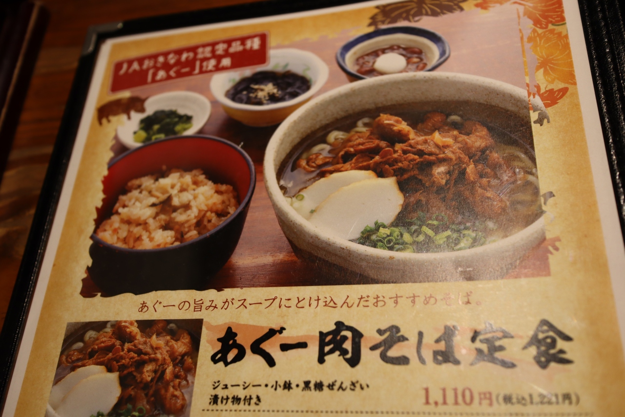 あぐーの旨味がスープに溶け込んだおすすめそば。炊き込みご飯のジューシー、小鉢、黒糖ぜんざい、漬物付きで1,110円(税別)は国際通りにあっては中々のコスパではないかと思います。近くにいた他人はあぐー丼に舌鼓を打たれていました。本当に美味しそうでした。- 旅行時期